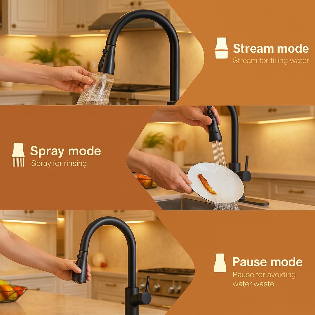 - 【Three functions design】:Faucet For Kitchen Sink 3 way spray setting(STREAM, SPRAY, PAUSE), stream for filling water, spray for rinsing, pause for avoiding splashing in multitask mode.CEC listed.