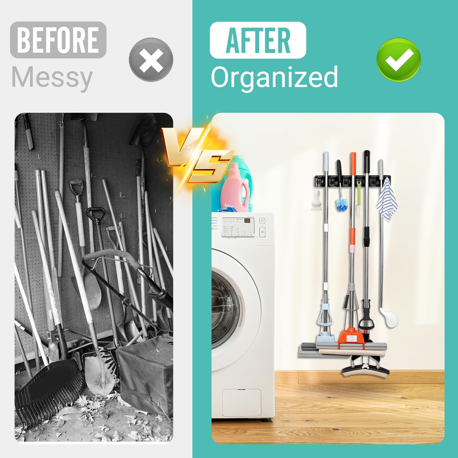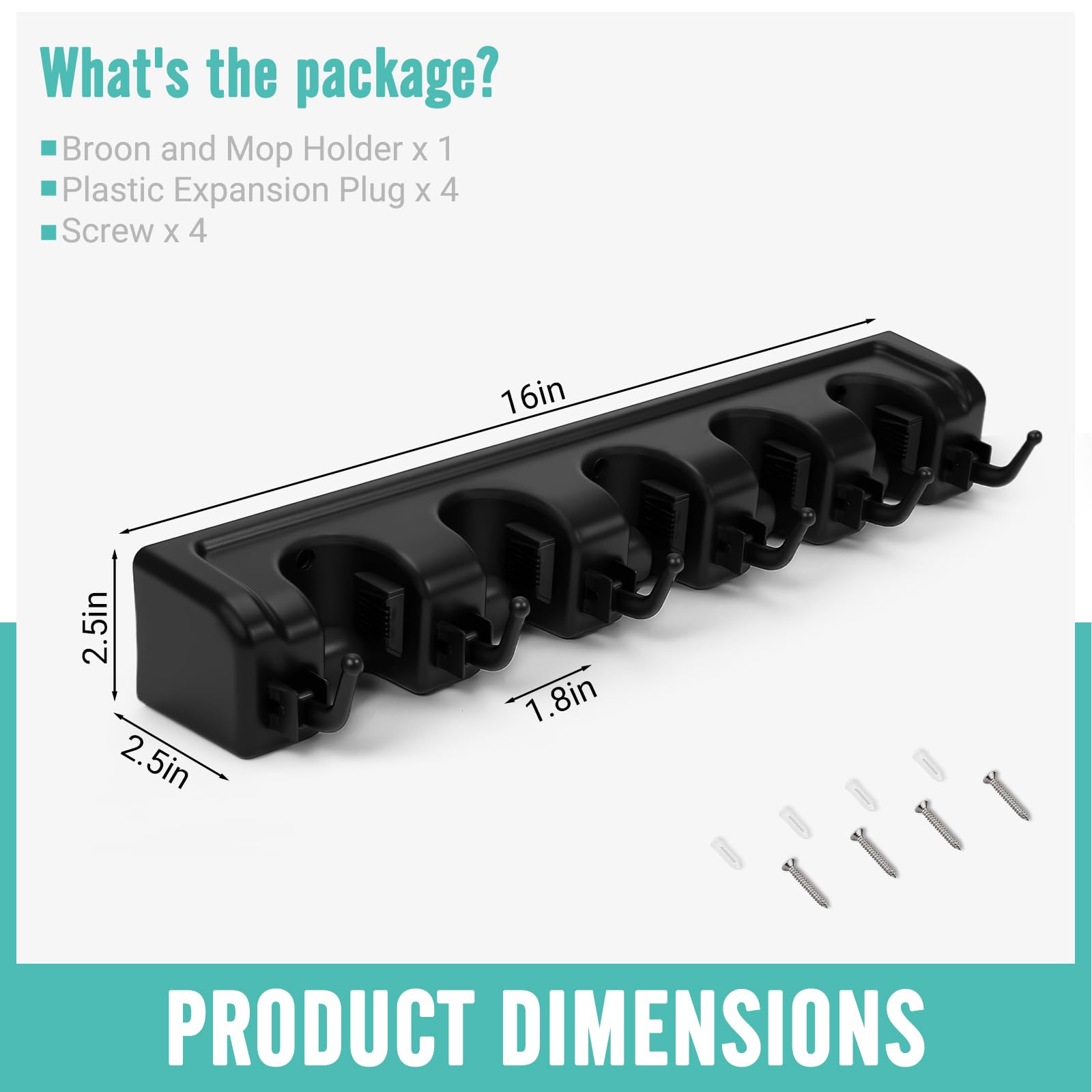 - Space-Saving Design: The wall-mounted broom holder helps you organize and store brooms, mops, and other cleaning tools vertically, freeing up floor space and keeping your home tidy.