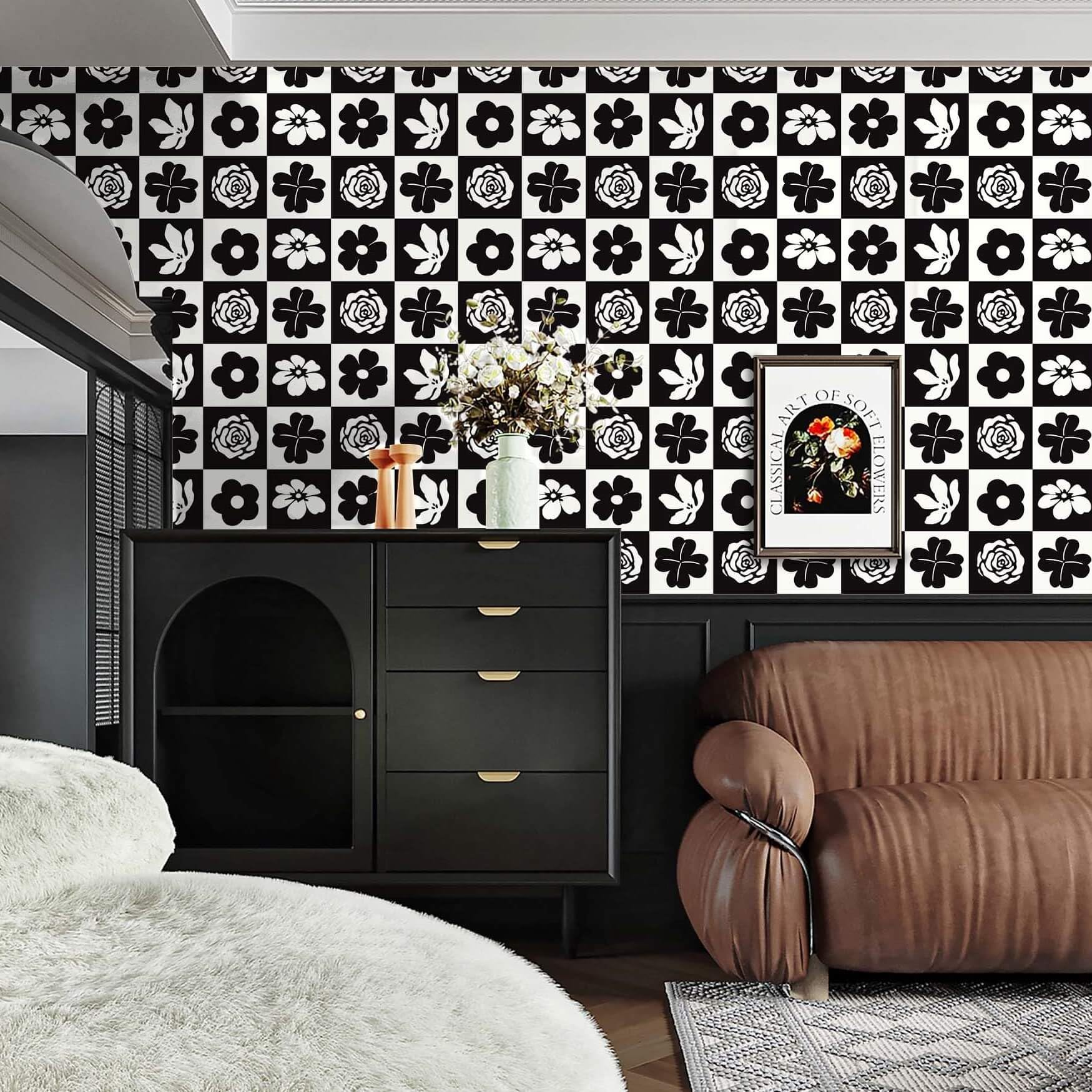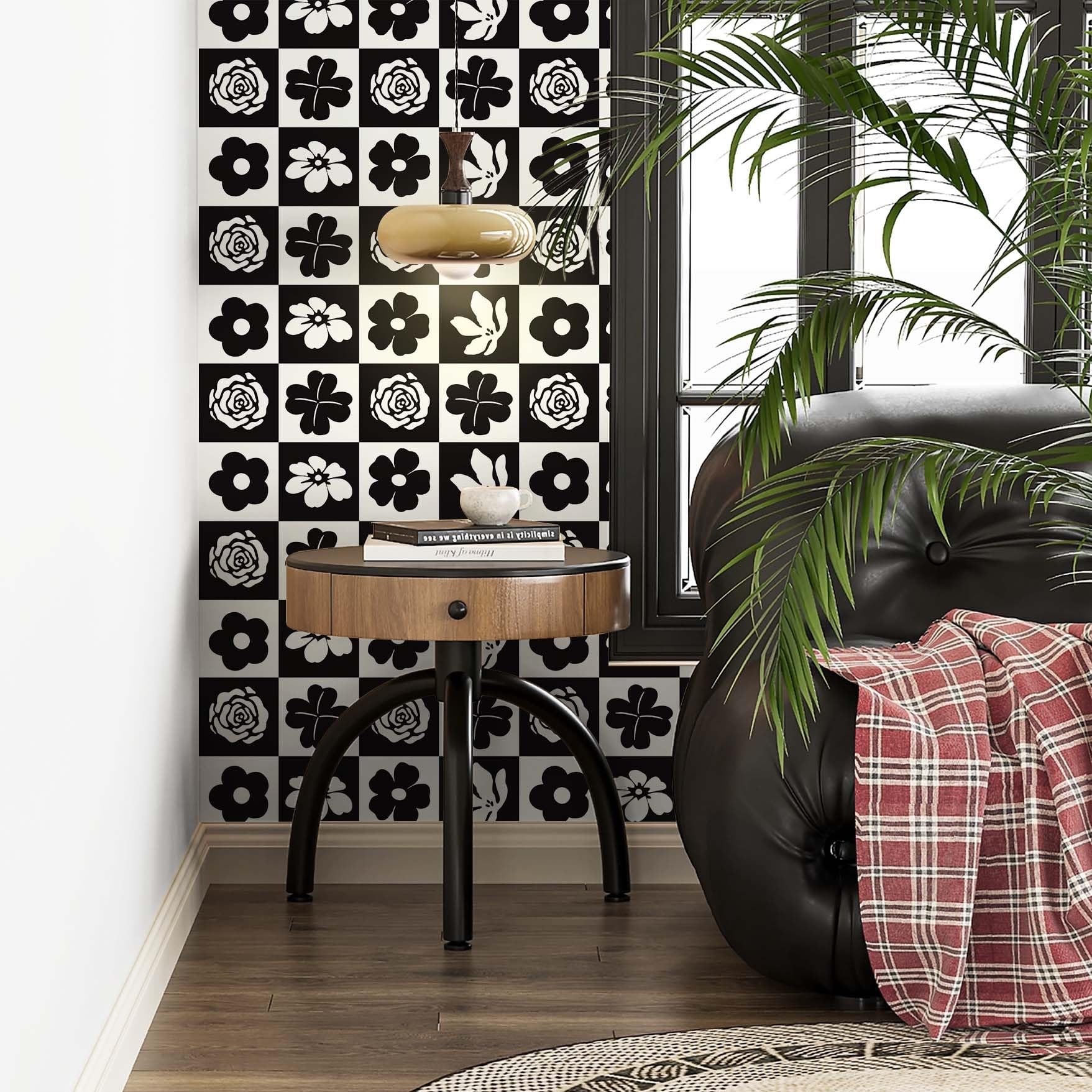 - CLASSIC & STYLISH: The black and white wallpaper features six unique black-and-white flower silhouettes, beautifully arranged on a classic checkerboard grid. The clean, minimalist design embodies modern aesthetics, adding a sharp and stylish touch to any space