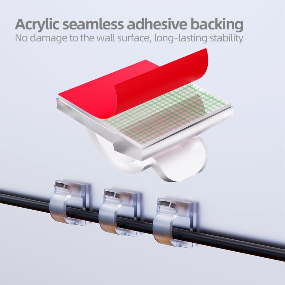 - Strong Adhesive: Made of PA66 material and upgraded adhesive, these cable clips can firmly hold cables, wires, and cords in place, remove without any residues and damage. Works on all clean surfaces like desks, walls, cabinets, wood, ceramics, metal, et