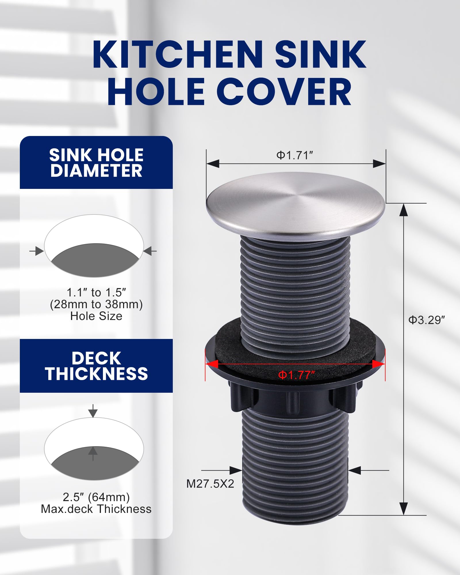 - 【Applicable Size】The sink plugs designed with a 3.29-inch long handle, 1.71-inch cover diameter, and 1.77-inch thread diameter,fits hole sizes from 1.1 to 1.5 inches.Max. deck thickness: 2.5 inches.