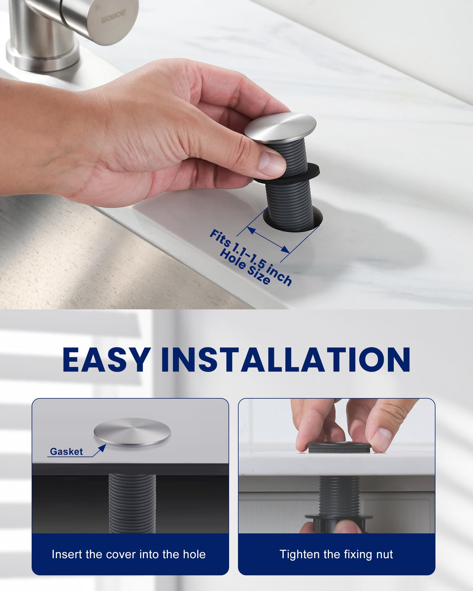 - 【Stylish & Versatile Sink Cover】Choose from multiple colors to match your decor. Smooth surface, simple and generous design.This sleek brushed stainless steel sink hole cap conceals holes while adding a modern touch to any kitchen or bathroom.