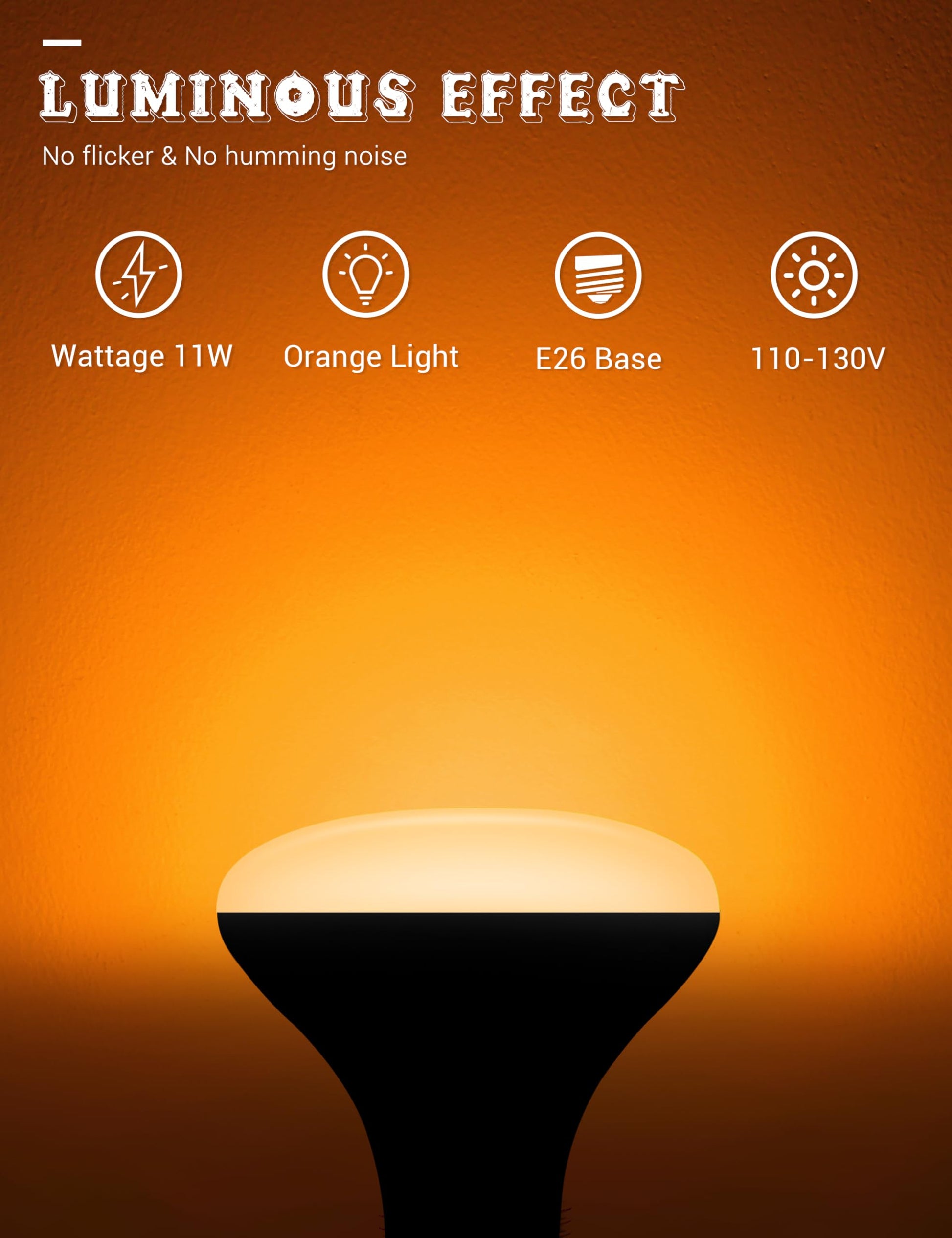 - Widely Application: The E26 base Halloween indoor flood light bulbs can be easily screwed into any corresponding holder. You can freely decorate your living room,bedroom or dining room with orange lighting to create a mysterious Halloween atmosphere .
