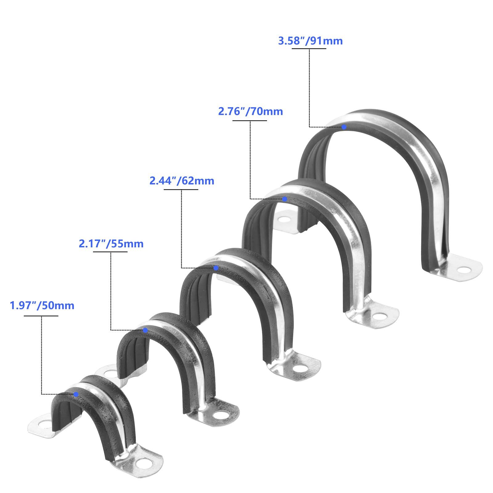 - 【SAFETY RUBBER PIPE CLAMPS】The inner diameter of the pipe clamps is covered with PVC rubber, which is more conducive to reducing the damage caused by vibration than traditional pipe clamps, and extends the service life of pipes and lines more effectively. Rubber non-slip insulation keeps your pipes firmly and safely fixed in the right position.