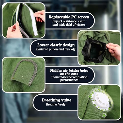 Jecery Sand Blasting Hood Mask with Replacement PC Lens Canvas Shawl Cap for Polishing Painting Dusting Grinding(Green,3 Replacement Lens)