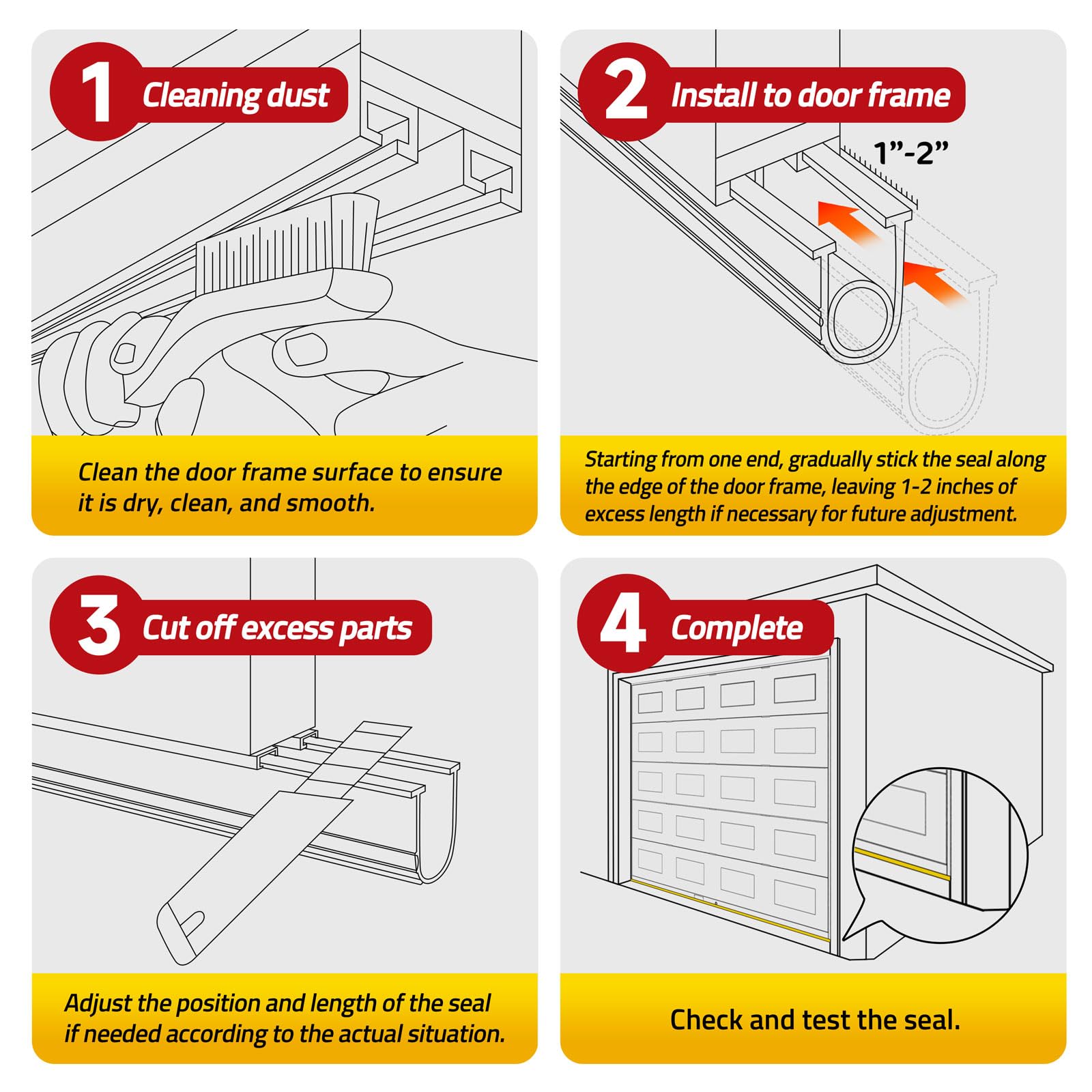 - Easy to Install: The seal strip comes with high-strength adhesive backing, allowing for easy installation on garage door frame in minutes. Due to packaging and shipping, the seal strip may experience slight shape deformation. If this occurs, we recommend using a heat gun to gently soften the seal and help restore its original shape for optimal performance.