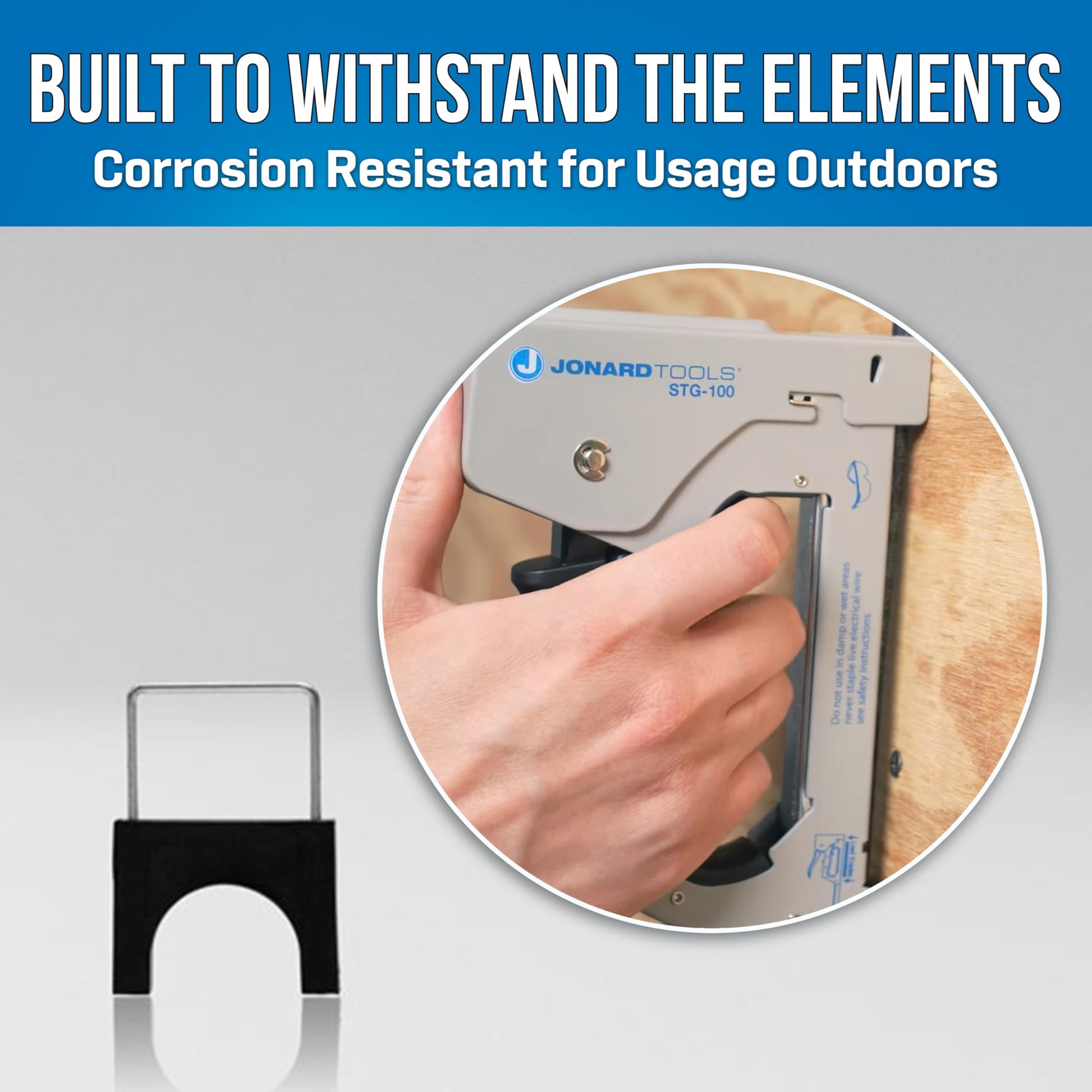 Details: Jonard Tools No. 19 1/4" by 5/16" black insulated cable staples are genuine Jonard fasteners, designed for use with the STG-100 TriggerTack™ wire and cable tacker. Each box has 300 pieces and is ideal for installing COAX RG59 Quad or RG6 wire. Is also perfect for Ethernet cables, telephone wires, TV cable, computer cable, intercom cable and security systems.
