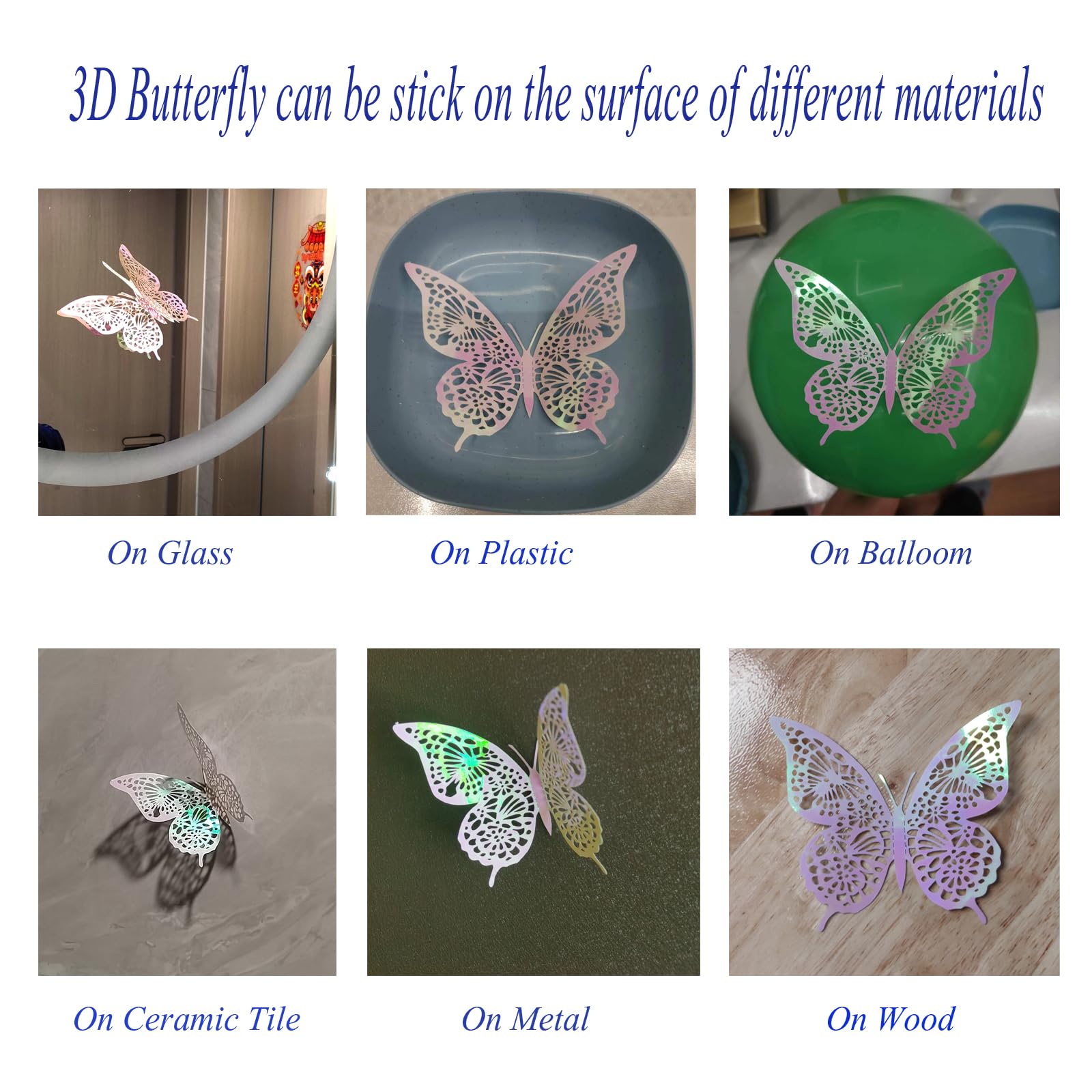 - ★Exquisite 3D metallic cutout :All the butterfly decorations are delicate, intricate patterns carved out of metallic paper and bright colors, creating a stunning illusion on the wall, not just the simple outline of the butterfly, but also the detailed cutout of the intricate pattern. The wings can be folded to achieve a 3D effect and vivid shape, and different angles and light casts contrast the butterfly's different metallic luster.