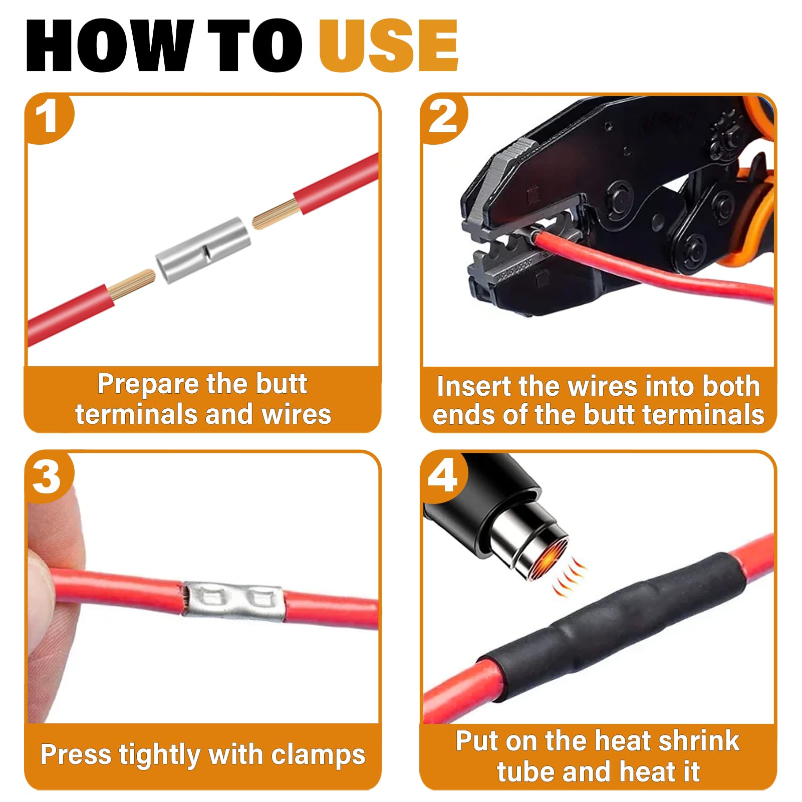 - HOW TO USE: Prepare the butt terminals and wires - Insert the wires into both ends of the butt terminals - Press tightly with clamps - Put on the heat shrink tube and heat it