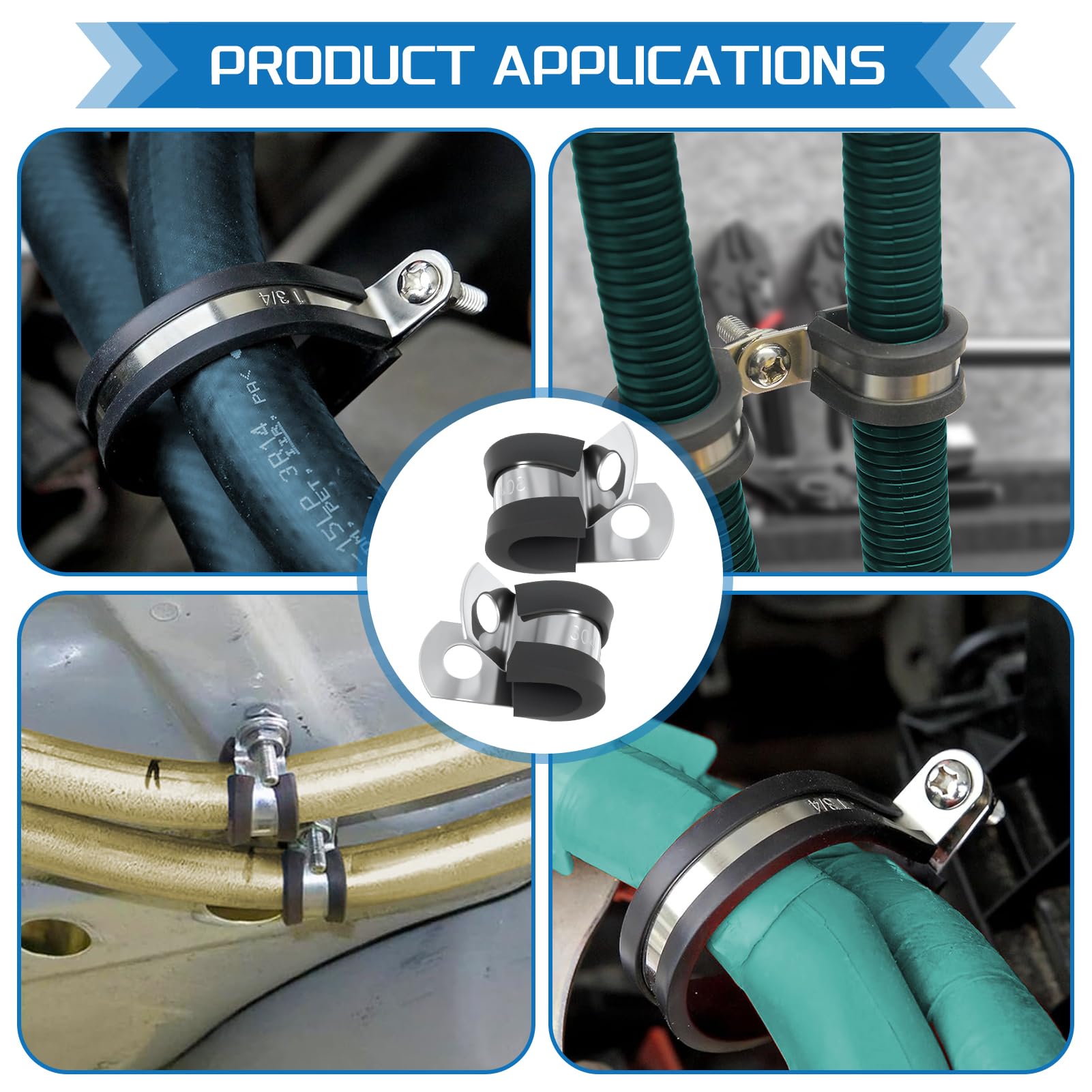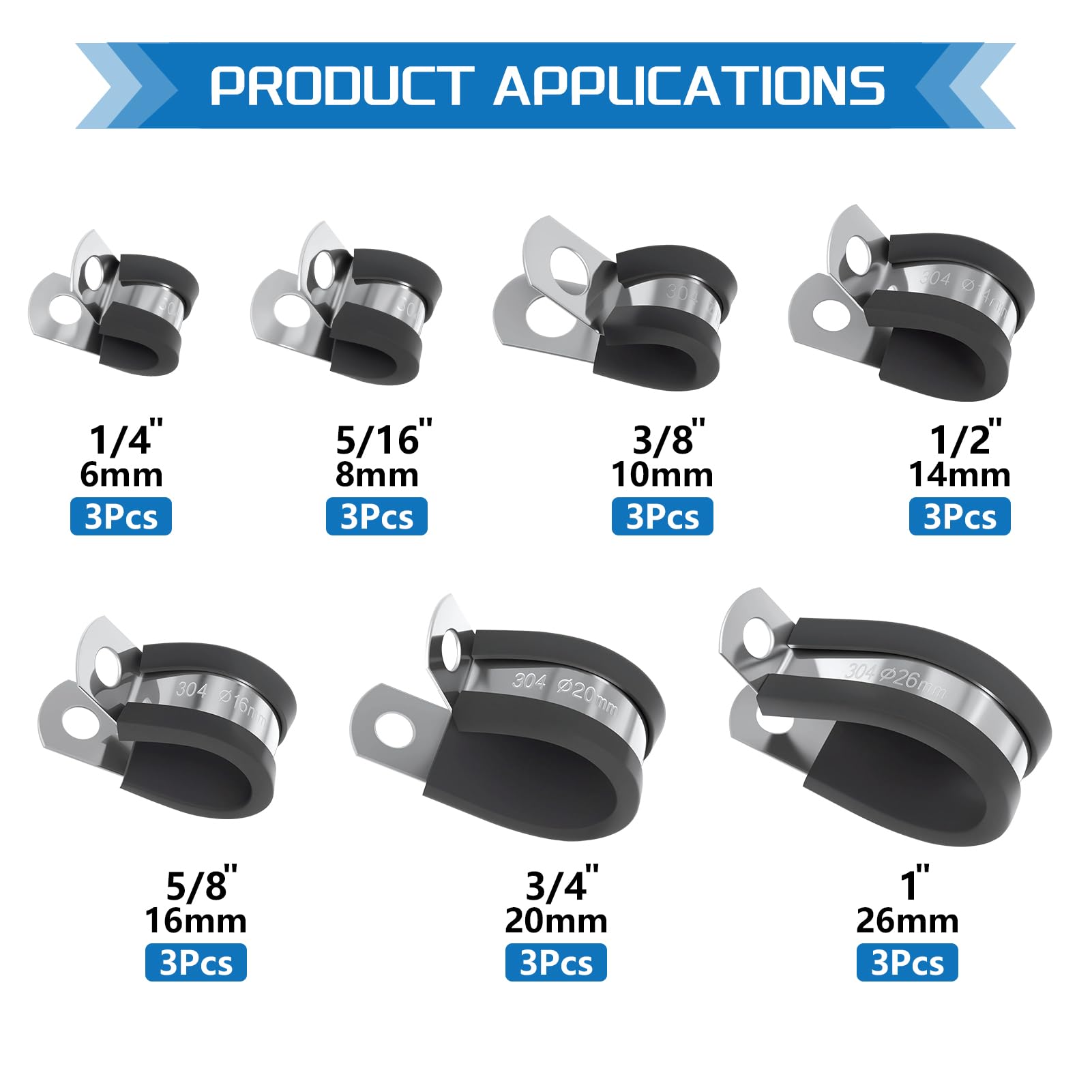 JTAREA 7Sizes 304 Stainless Steel Cable Clamps Assortment Kit 1/4" 5/16" 3/8" 1/2" 5/8" 3/4" 1" Cushion Cable Clamp Rubber Coated Wire Clip Pipe Clamp