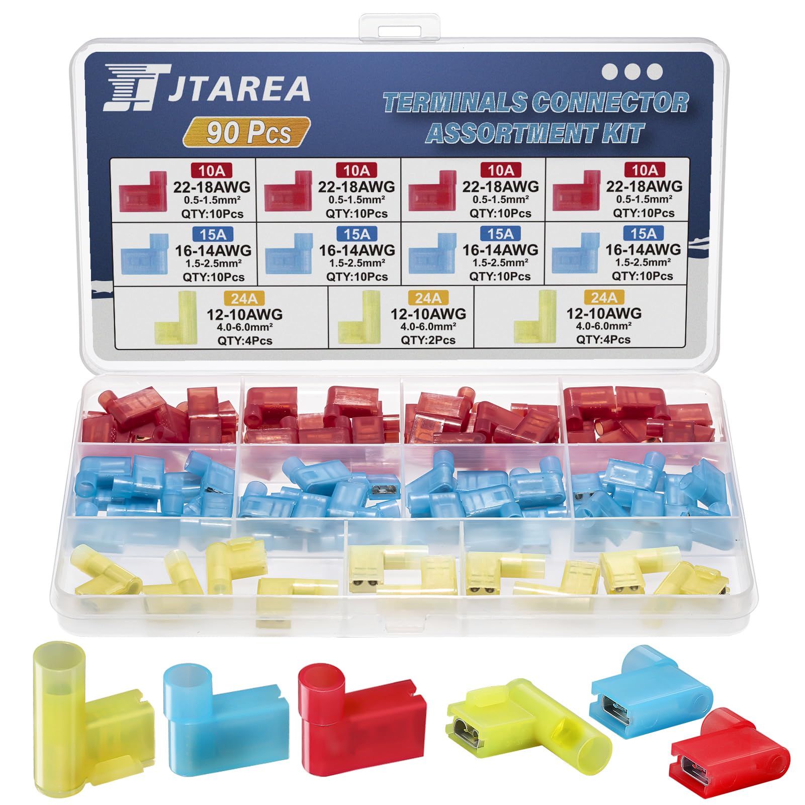 JTAREA 90PCS 3 Values 90 Degree Right Angle Flag Spade Connector Wire Terminal Crimp Connectors Quick Disconnect Female Nylon Crimps Terminals for 22-18 16-14 12-10 AWG Gauge Wiring