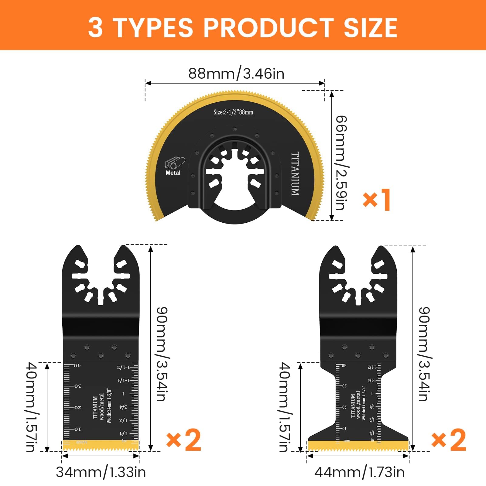 - 3 Types 5 PCS: The power oscillating tool blades value set includes: 2pcs 1-3/8 inch, 2pcs 1-3/4 inch, 1pc 3-1/2" Semi circle flush cut saw blade. NOTE: You can cut soft metal, wood, and plastic. Can't cut hard steel(Steel Nails, Steel Bolts)