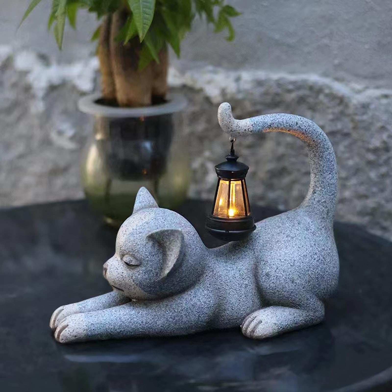 - Unique Design: Made of robust resin material,the adorable cat extending its forelimbs forward and make a deep stretch, with a lantern hanging on its upturned tail, is very relaxing. The figurine size: 10.2 x 4.9 x 7.9 inches, Lamp size: 1.8 x 1.8 x 3.3 inches