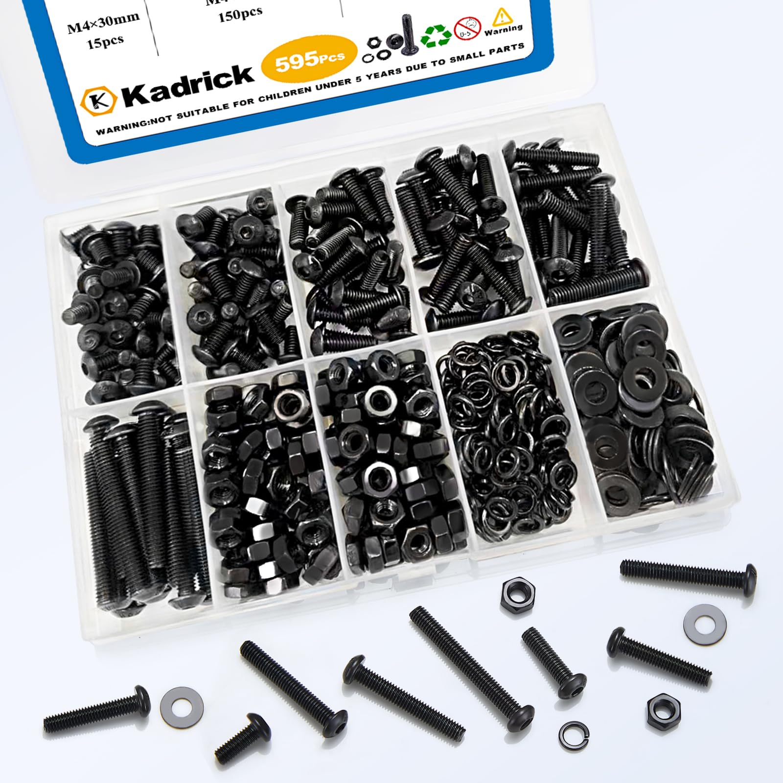 Kadrick 595Pcs M4 Screw Assortment,Machine Screws with Nuts Washers, Grade 10.9 Alloy Steel Hex Socket Button Head Black M4 Bolts Kit,Lenth Form 6mm-30mm