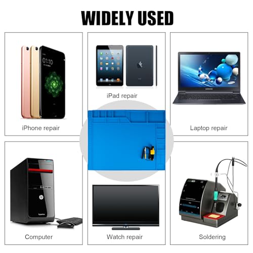 - [Big size work area design more widely used]- This lager silicone work mat is carefully designed to reduce unnecessary tools placement and increase the area of the work area.You no longer have to worry about the mat is too small to complete work. It can provide more space to meet the repair needs of lager electronic devices and soldering projects, such as repair computer,laptop,MacBook,iPad,iphone,drone,circuit board,camera and more.It is very suitable for repair shops,DIYer and workshops