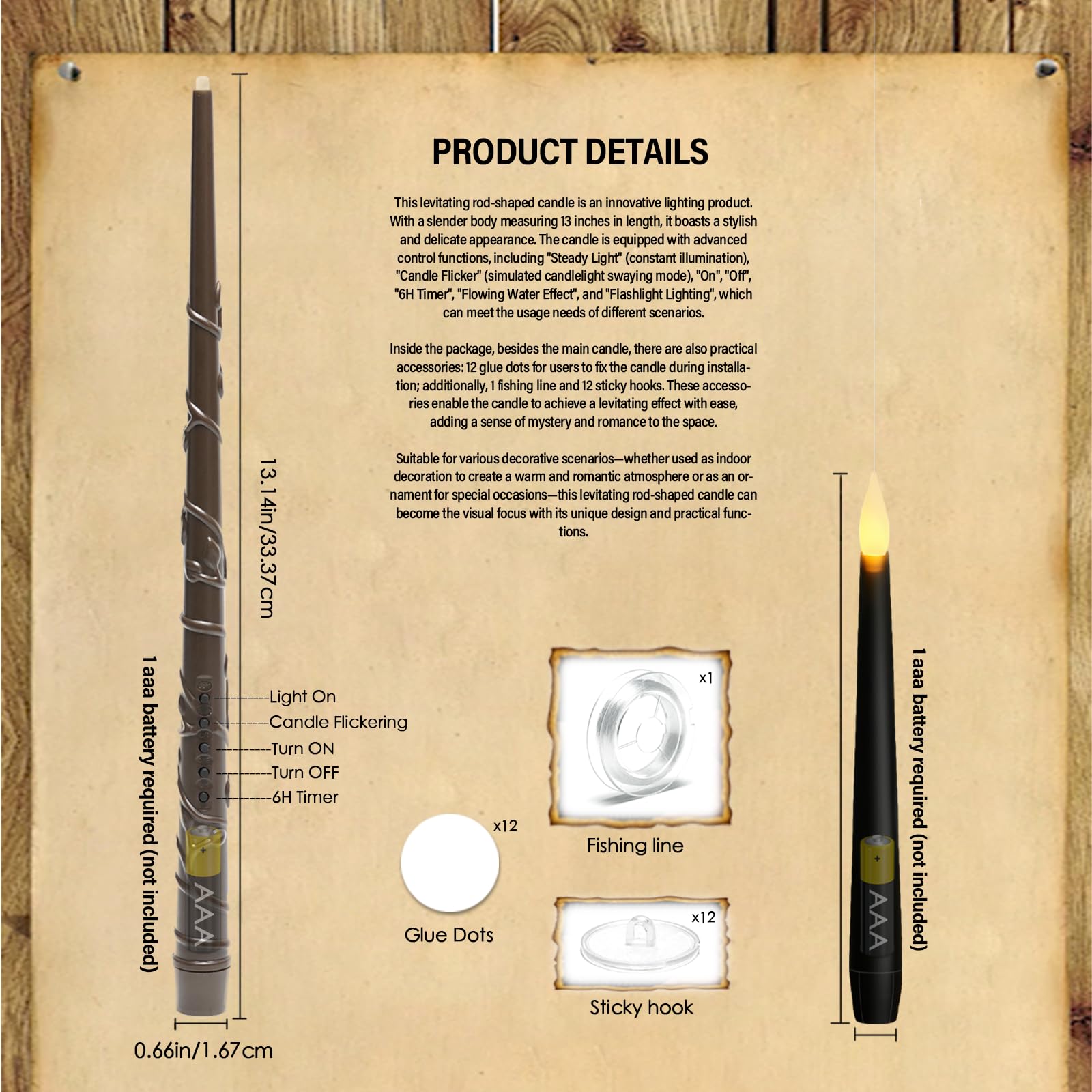 - 【Packaging includes】:Each floating candles and the wand remote both require 1 AAA battery(not included),Each set contains 12 pieces of 0.51"(D)×6.7"(H) LED candles,1*wand remote control, 12 *sticky hooks,1*roll of fishing line.