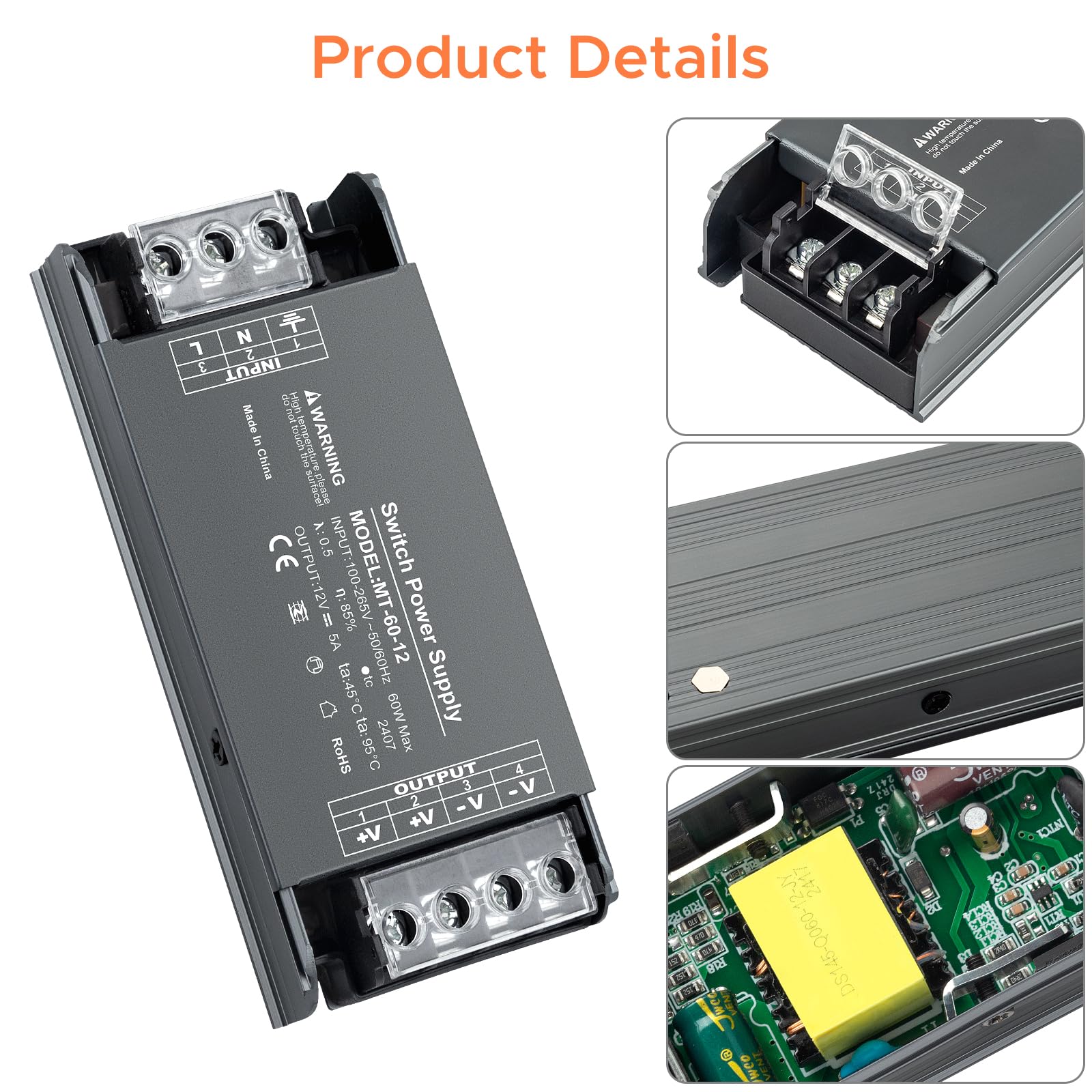 - Parameters: LED Driver Input: 100-265V AC, Output: 12V DC, 5A, 60W max, ideal for high-power LED applications