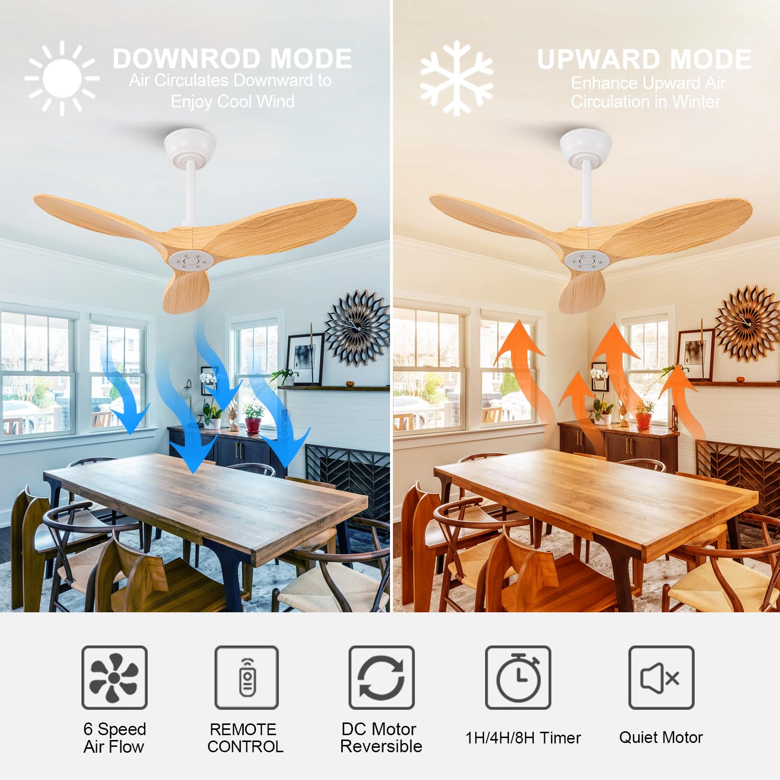 - Reversible DC Motor: Elevate your comfort with our fan’s innovative reversible function. Perfect for any season, simply switch directions to either circulate cool air in the summer or gently push warm air down in the winter. Enjoy year-round comfort with just the touch of a button.