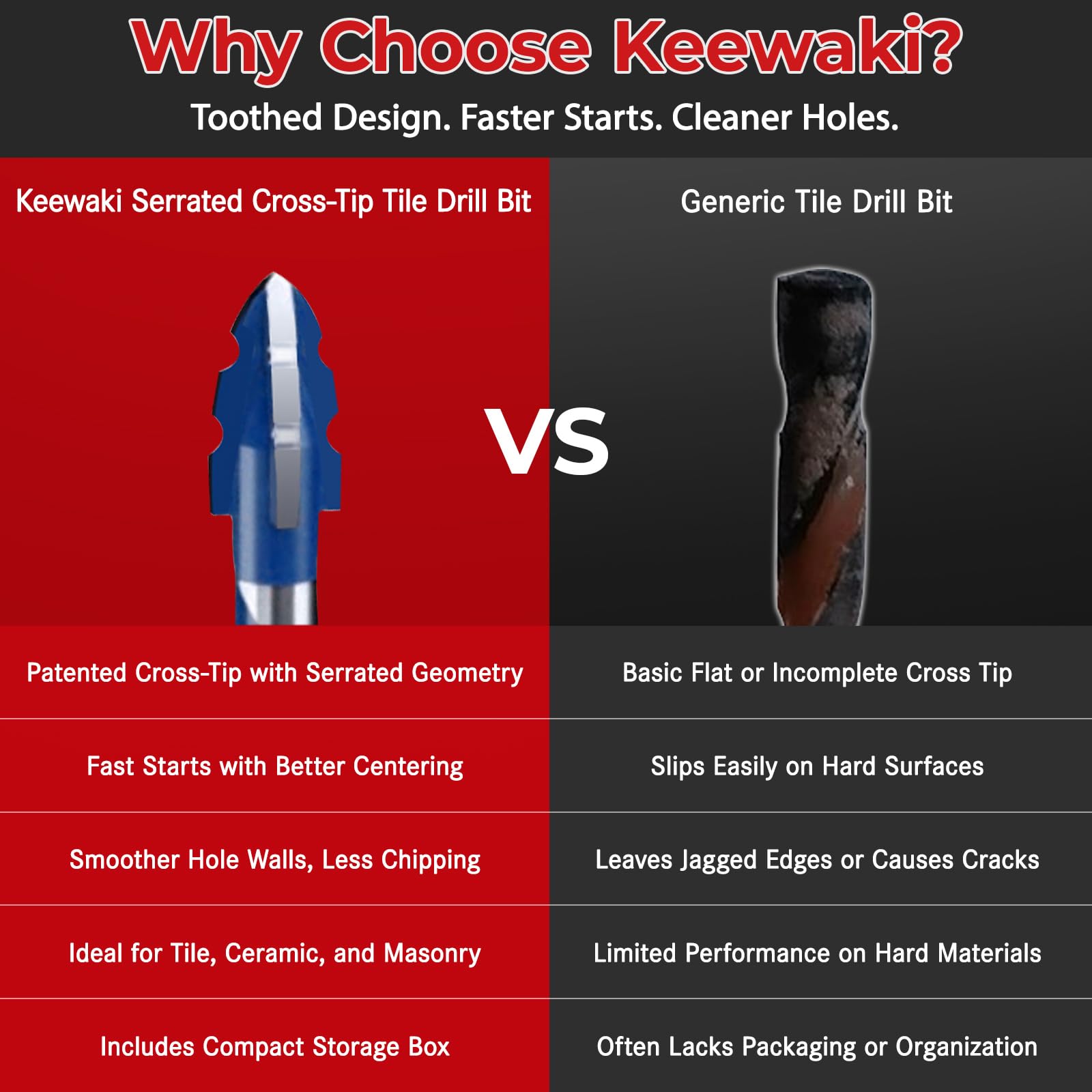 - Cross-Tip Carbide Teeth for Faster, Cleaner Cuts Keewaki’s upgraded tile drill bits feature a 4-cutter cross-tip carbide head with serrated edges, delivering smooth entry and superior cutting speed. Drill more holes in less time with cleaner results—no cracking, no mess.