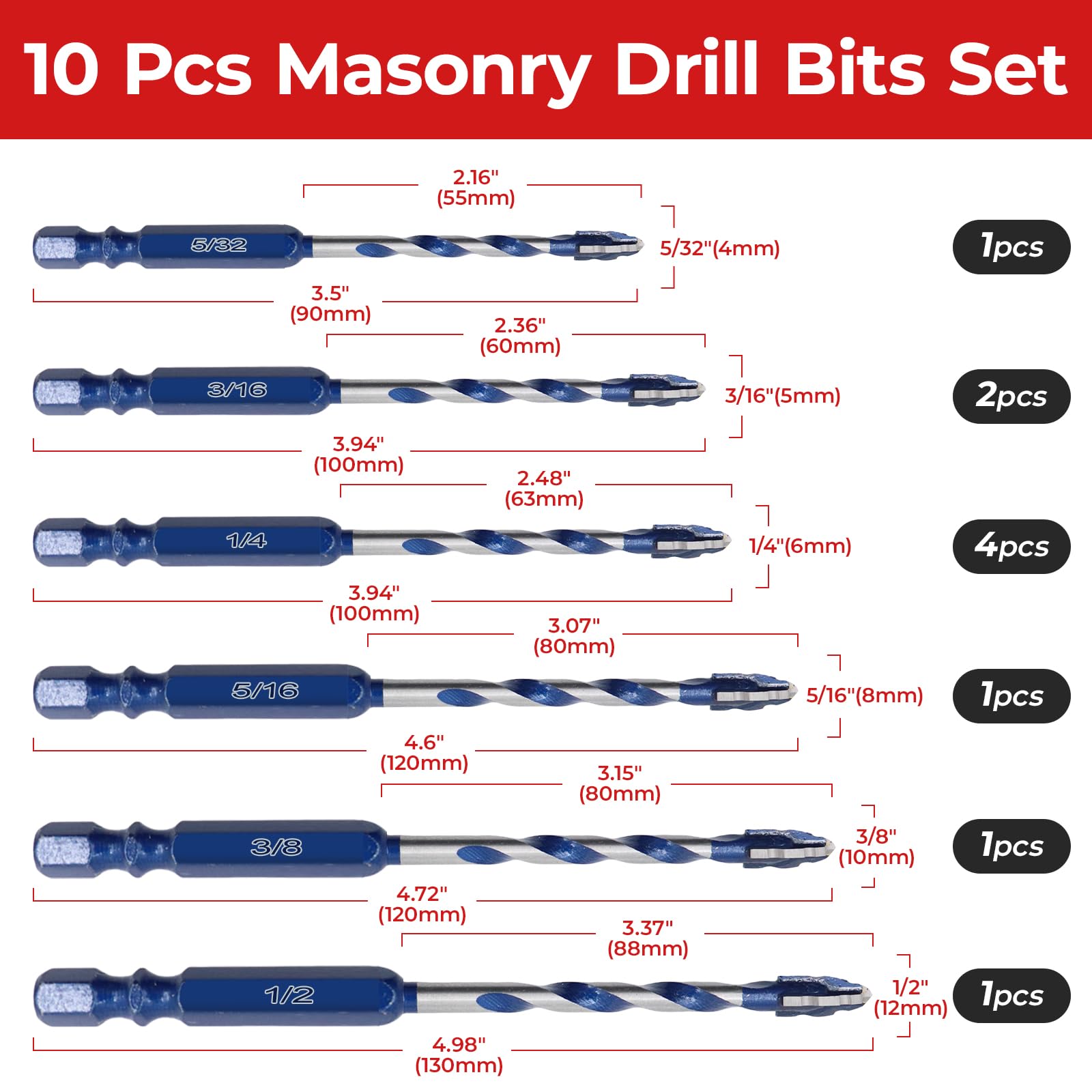 - Premium 10-Piece Multi-Purpose Set Includes 10 durable masonry drill bits in the most practical sizes: 5/32", 3/16" (x2), 1/4" (x4), 5/16", 3/8", and 1/2". Tackle tile, concrete, wood, or plastic with one versatile set—perfect for both professionals and DIYers.