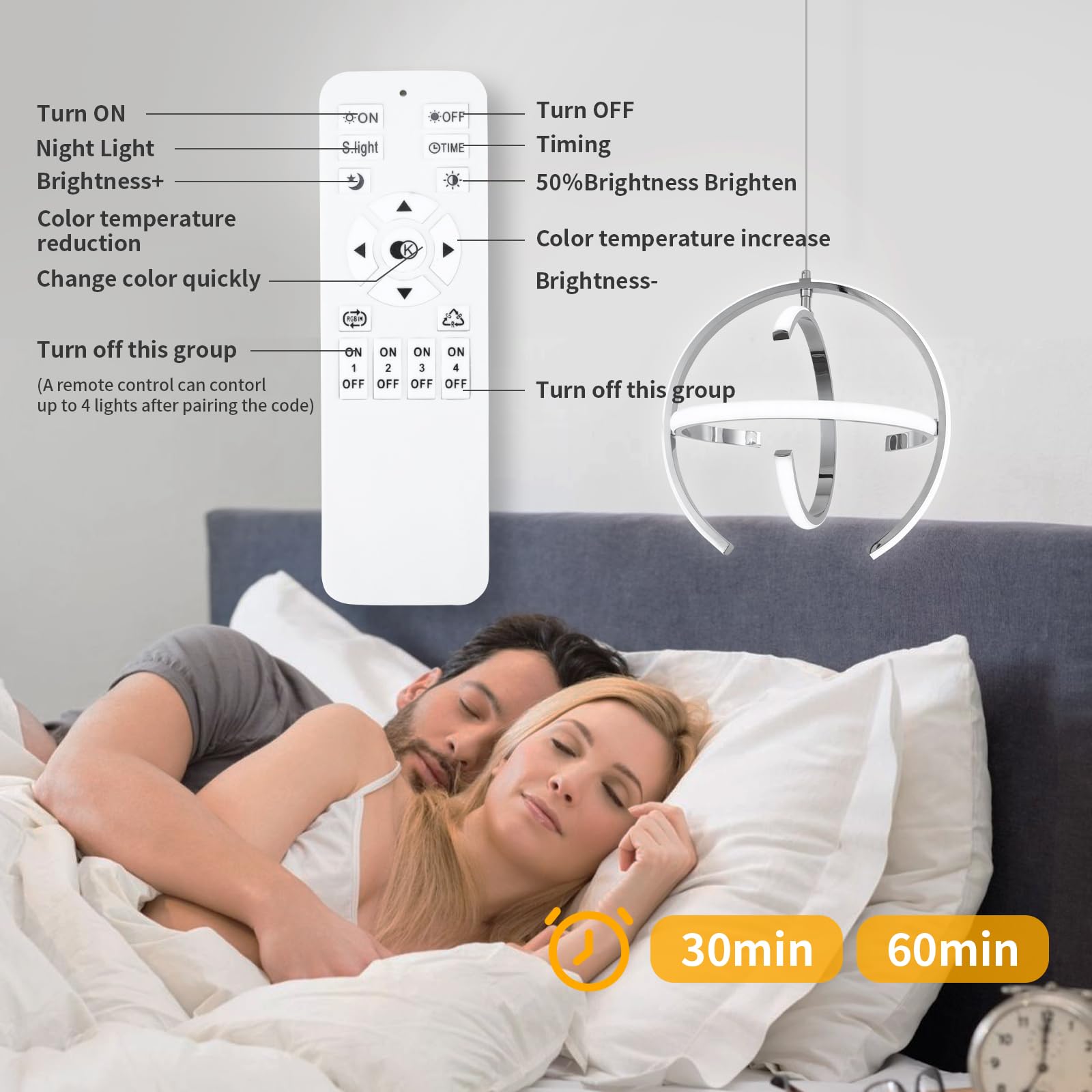- 【Multi function remote control】This metal LED chandelier comes with a remote control that supports remote control and adjustment, the color temperature is adjustable from 3000k-6000k, the brightness is adjustable from 10%-100%, and there are two timer functions, you can set the light to turn off automatically after 30 or 60 minutes. Including memory function, you can save the last lighting mode set by the remote control to make your life more convenient. No strobe, no harsh or flickering soft light to protect your eyes and provide a relaxing atmosphere.
