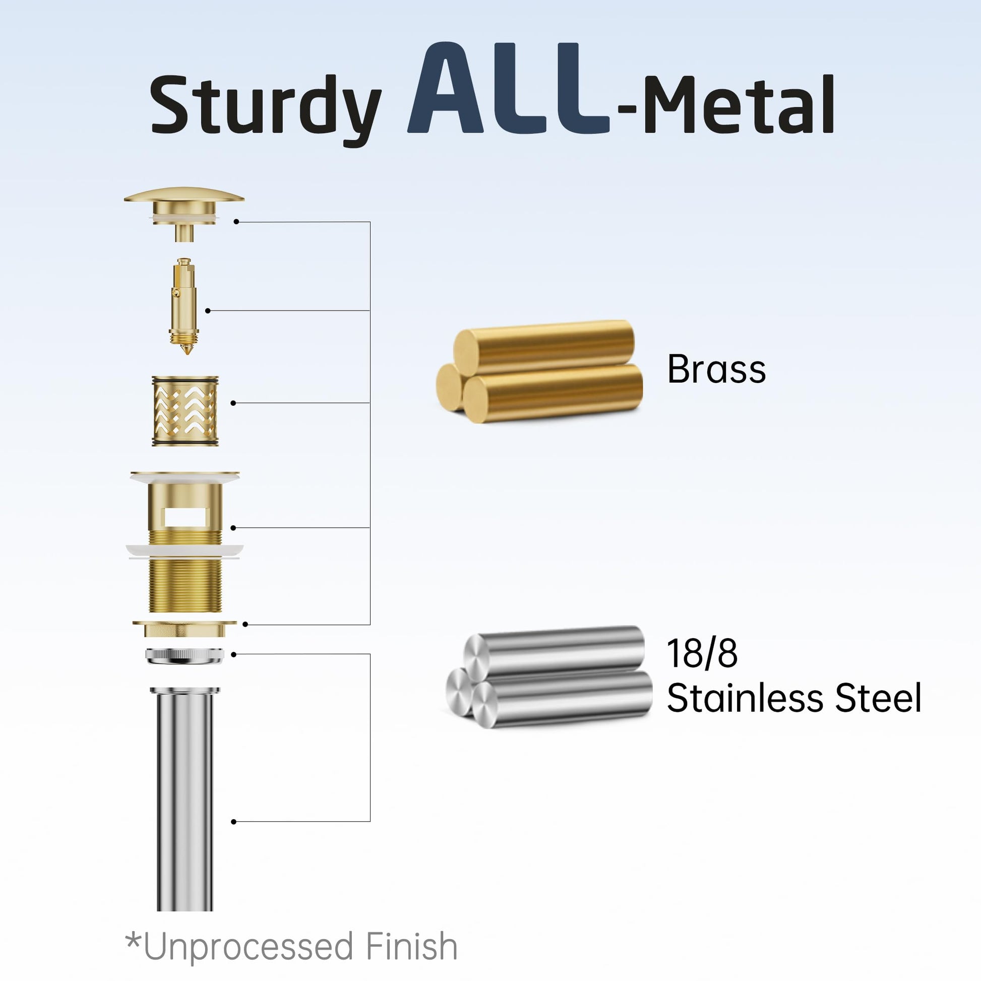 - All Metal - Durable: This bathroom sink drain is crafted from solid brass and premium 304 stainless steel, featuring a heavy-duty structure that ensures it won't break or leak; Its corrosion and rust resistance guarantees stable performance