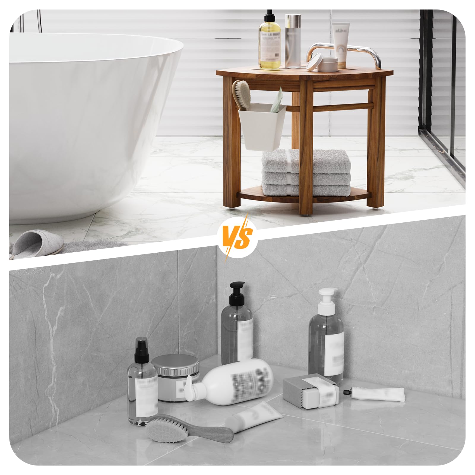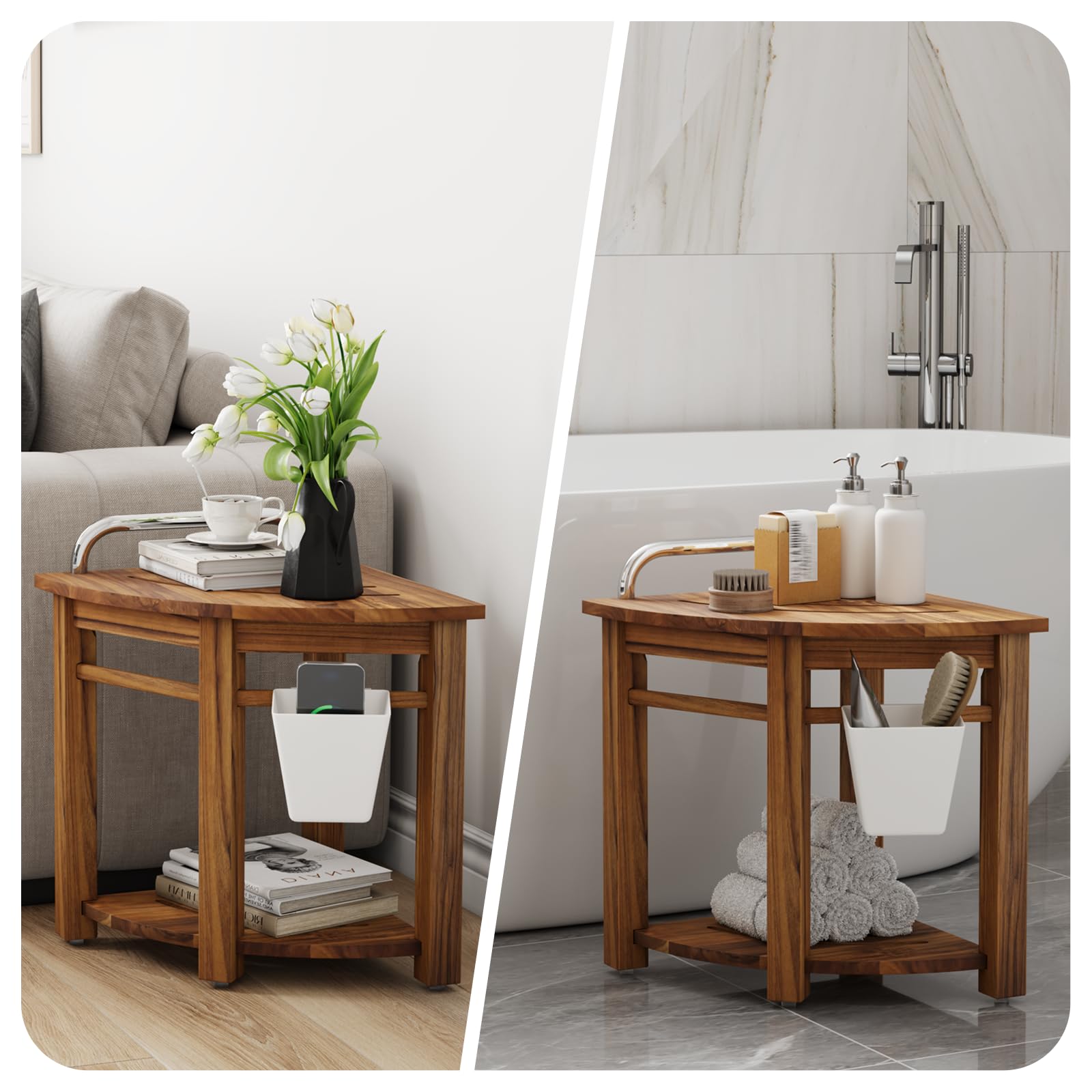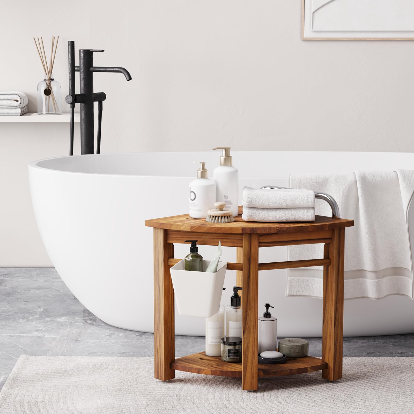 - [Teak Wood Material] Natural Teak Wood Corner Shower Bench. this wooden shower stool is durable and water resistant, bringing a spa like luxury to your shower experience