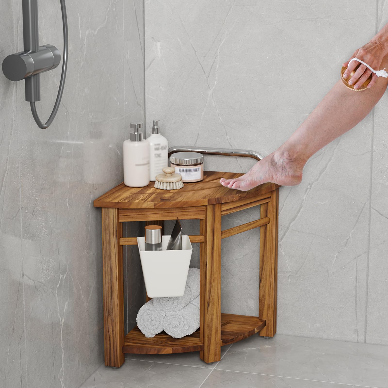 Kiasthome Teak Corner Shower Bench, Waterproof Bathroom Teak Shower Bench, Sturdy Non-Slip Bath Shower Foot Stool for Shaving Legs with Storage Baskets and Shelves