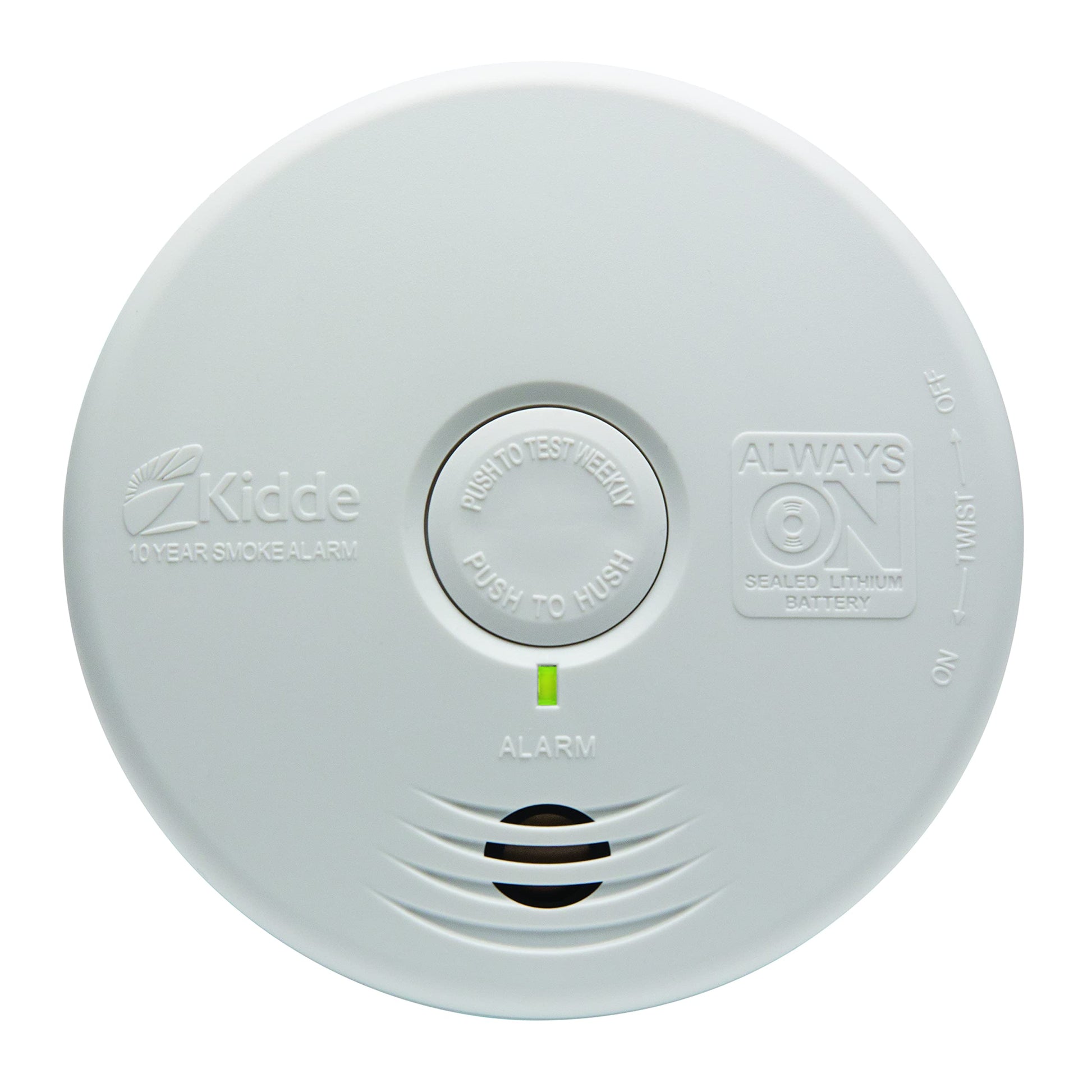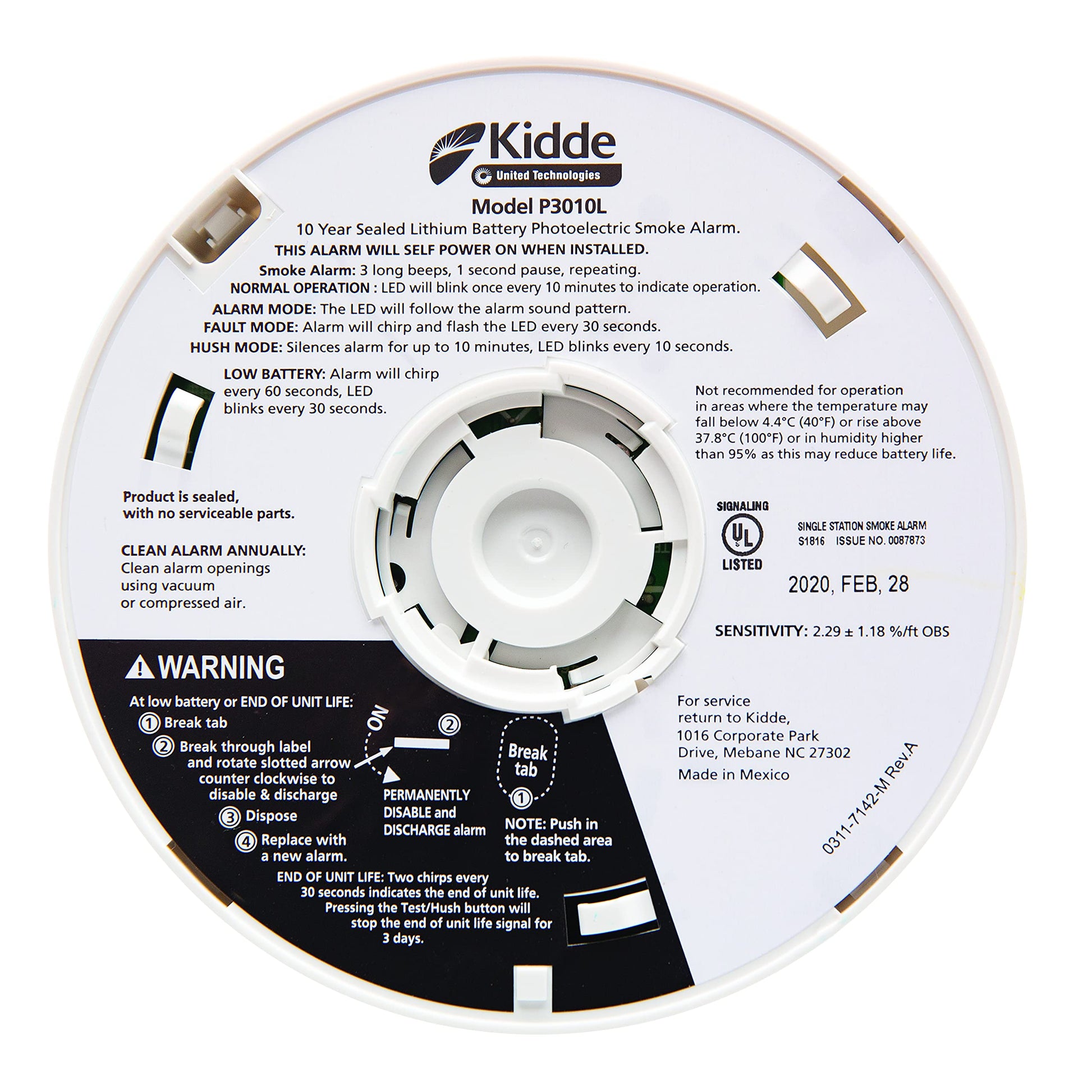 Details: The Kidde Smoke Detector, 10-Year Battery, Photoelectric Sensor Smoke Alarm, model p3010l, uses photoelectric sensor technology to detect visible fire particles (associated with smoldering fires). When smoke or fire is detected, an 85-decibel alarm will sound. The Kidde Smoke Detector is powered by a 10-year lithium battery, for coverage during a power failure, while eliminating the need for battery changes. A test-hush button allows you to test the battery operations as well as silence nuisance alarms that may occur from cooking or shower steam. The Kidde Smoke Detector will chirp when it's time to replace the battery. Install a smoke detector & carbon monoxide detector on every level of your home and near bedrooms to help keep your family safe from fire & poisonous gas. UL Certified with a 10-year limited manufacturer's warranty. Meets requirements of UL 217, NFPA72 (chapter 11 2002 edition), NFPA101 (One and two-family dwellings), and Federal Housing Authority (FHA).