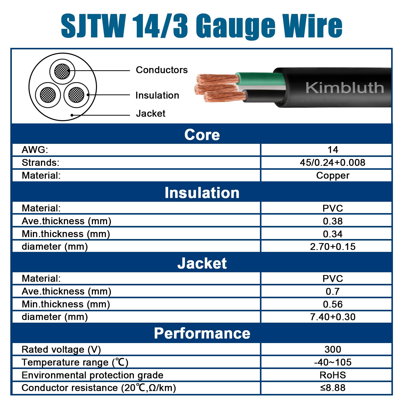 Kimbluth 14 Gauge 3 Conductor Wire SJTW Outdoor Extension Power Cable 100FT, 14/3 Wire Heavy Duty Pure Copper Electrical Wire for Lawn, Battery, Automotive, Outdoors