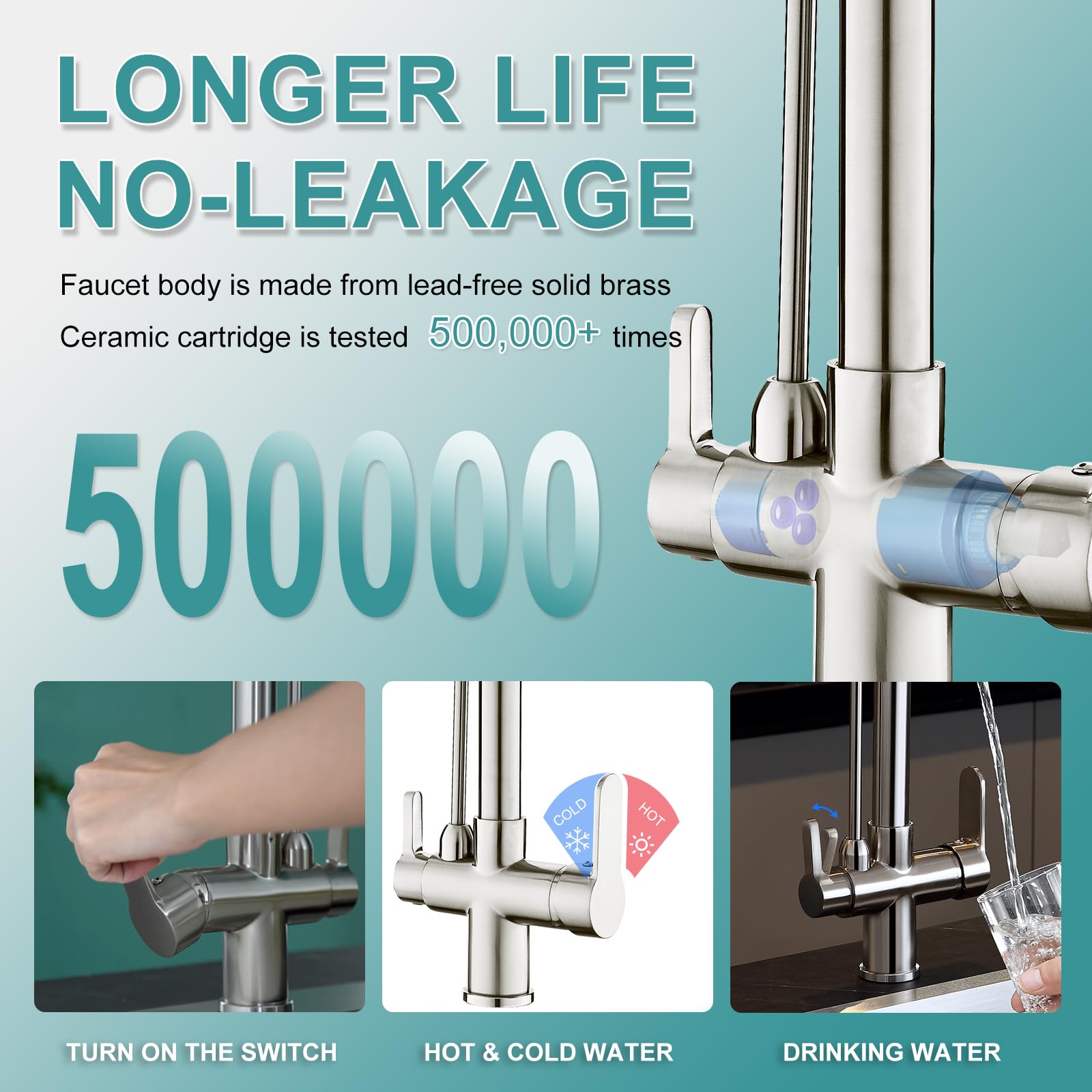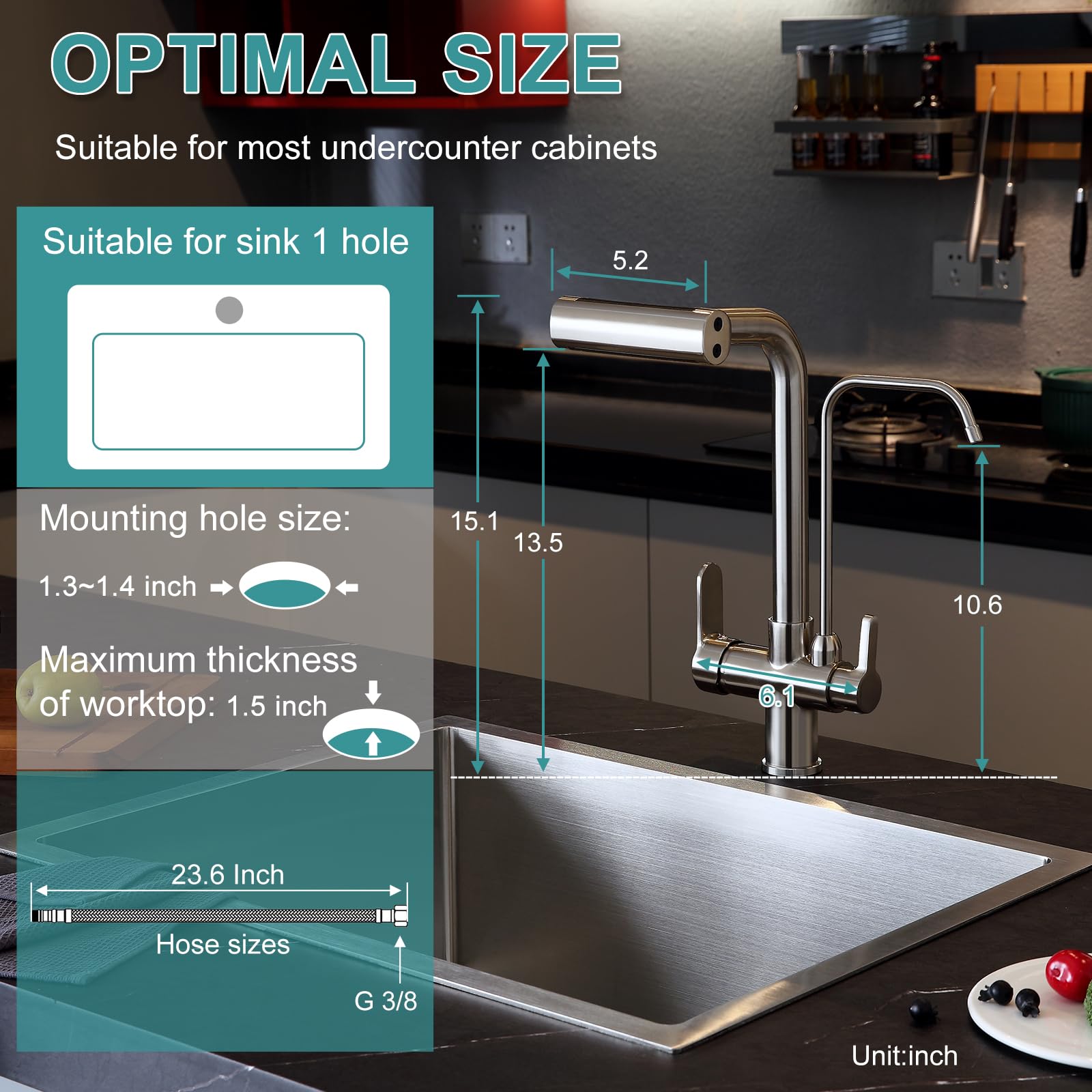 - 【3-in-1 Water Filter Faucet]】 3-way kitchen faucet includes Hot & Cold and RO water. Employing a single hole faucet streamlines your countertop, offering a sleeker and more organized space. 3-in-1 water fliter faucet is compatible with standard osmosis system. Dual handle design allows you to use Hot & Cold water faucet and water purifier faucet at the same time, which combines the benefits of each other