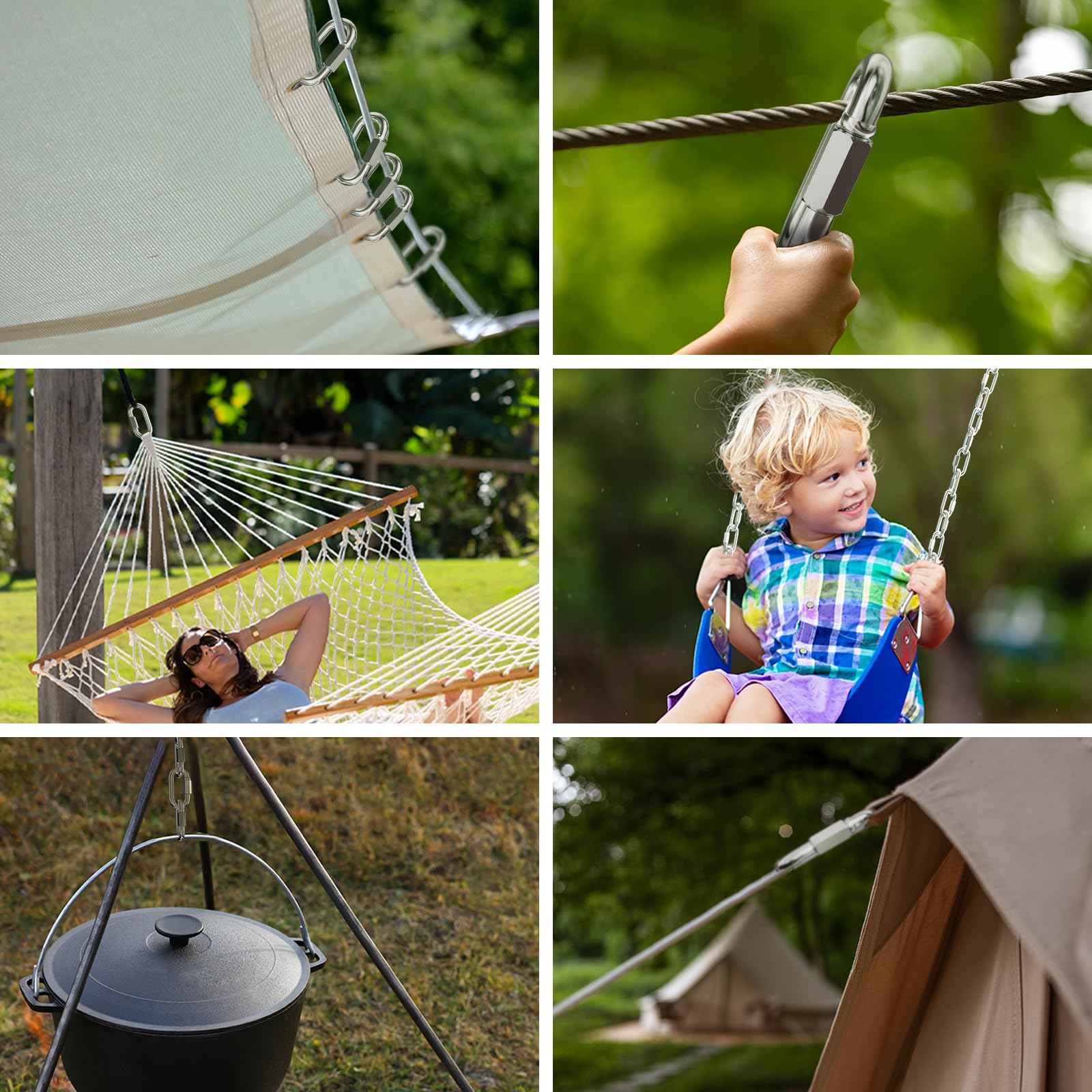 - WIDE APPLICATIONS: These quick links are ideal for daily life. It’s optimal for chain links, fence gates, swings, pets chain, shade sails, fitness equipment, DIY accessories, or hanging a chandelier. Chain connector links can also be used for outdoor activities, such as camping, fishing, hiking, traveling, shade sails, carabiners, and so on.