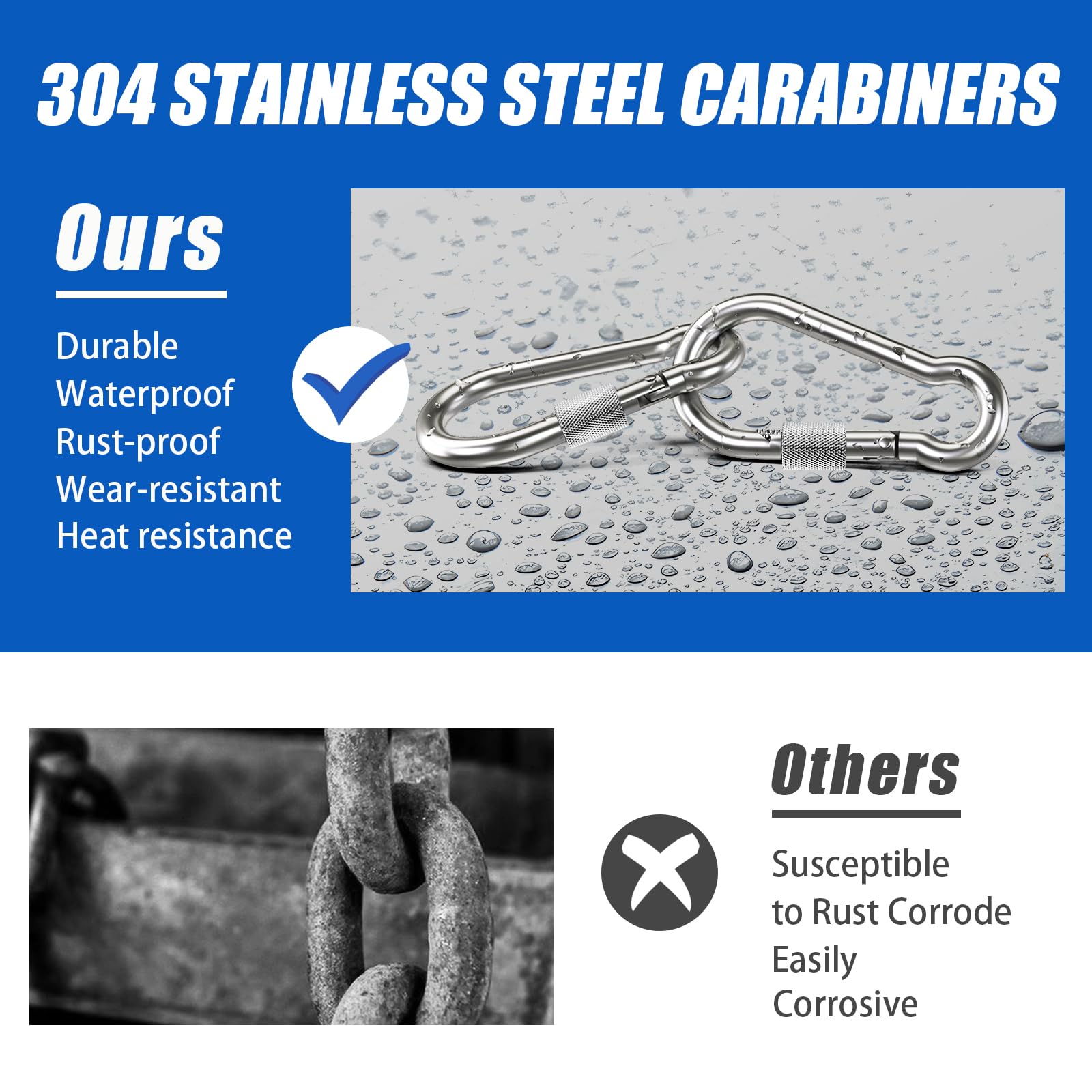 - 【HIGH-QUALITY MATERIAL】The carabiner clips made from premium stainless steel, our are strong, waterproof, rust-proof, and wear-resistant. These high-quality materials ensure durability and reliability, allowing you to use them confidently for a long time.