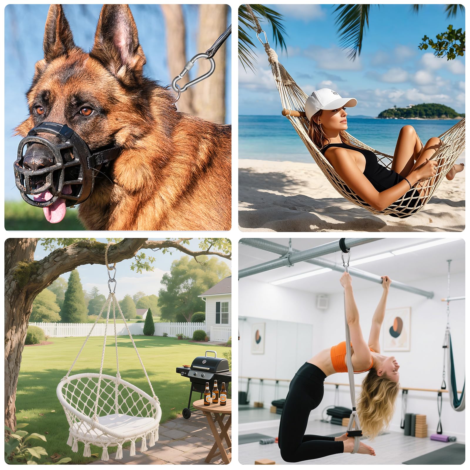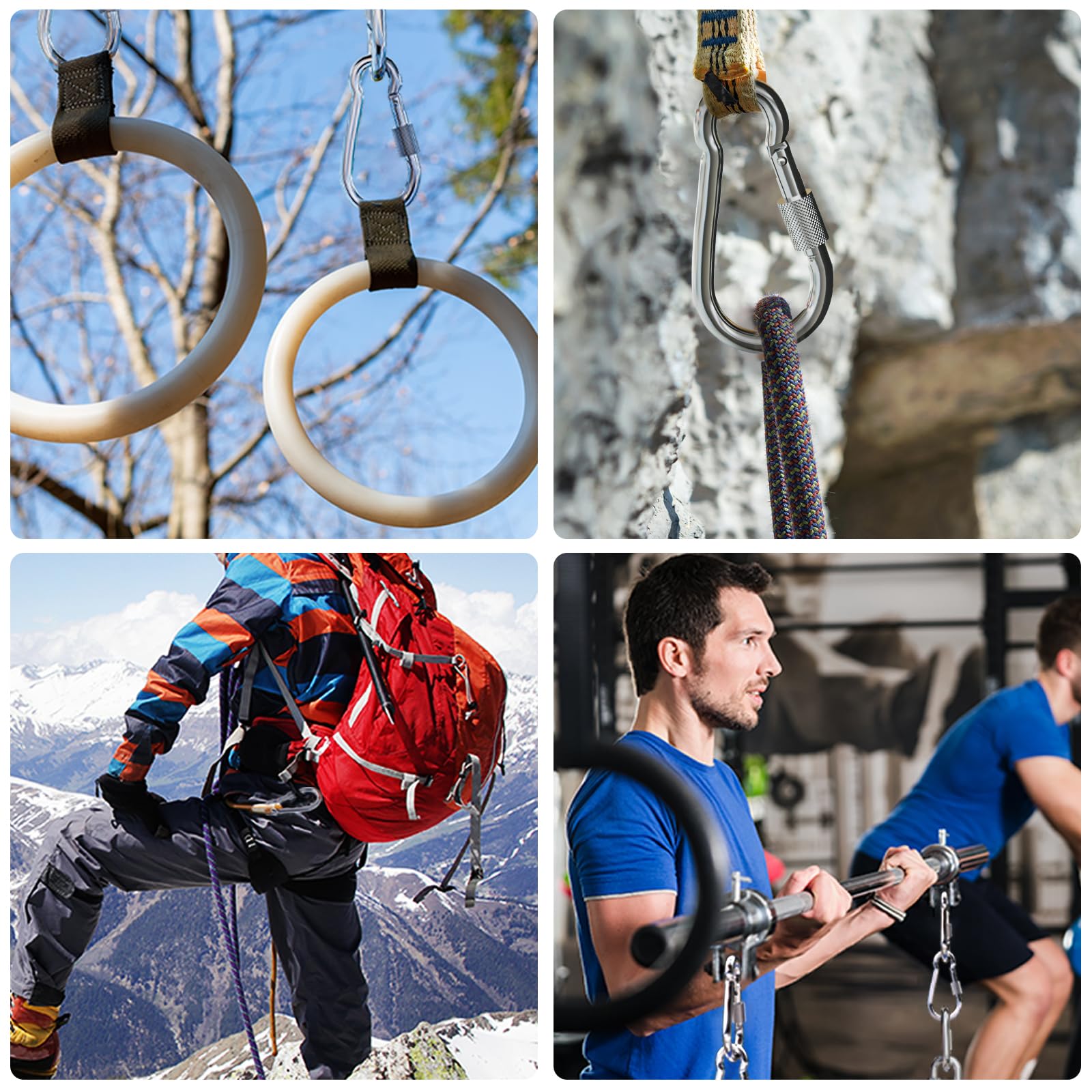 - 【VERSATILE USE】Our snap hook carabiners are perfect for both indoor and outdoor activities such as sailing, camping, fishing, hiking, and traveling. They can clip onto chains, ropes, hammocks, swing sets, punching bags, or your dog leash. They're also great accessories for gym workouts,easily attaching home gym equipment or any other lifting machine.