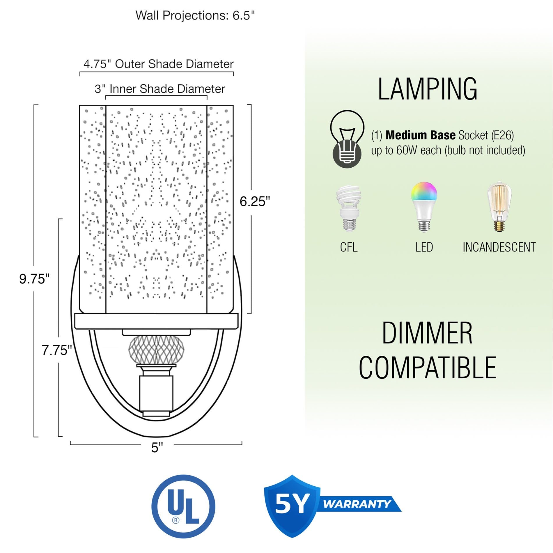 - [ETL LISTED FOR YOUR SAFETY] ETL listed for damp locations. Uses (1) LED, CFL, or up to 60W traditional incandescent medium base bulb. Bulb sold separately. Dimmer compatible. Includes all hardware for quick installation of this classy, elegant silver wall sconce