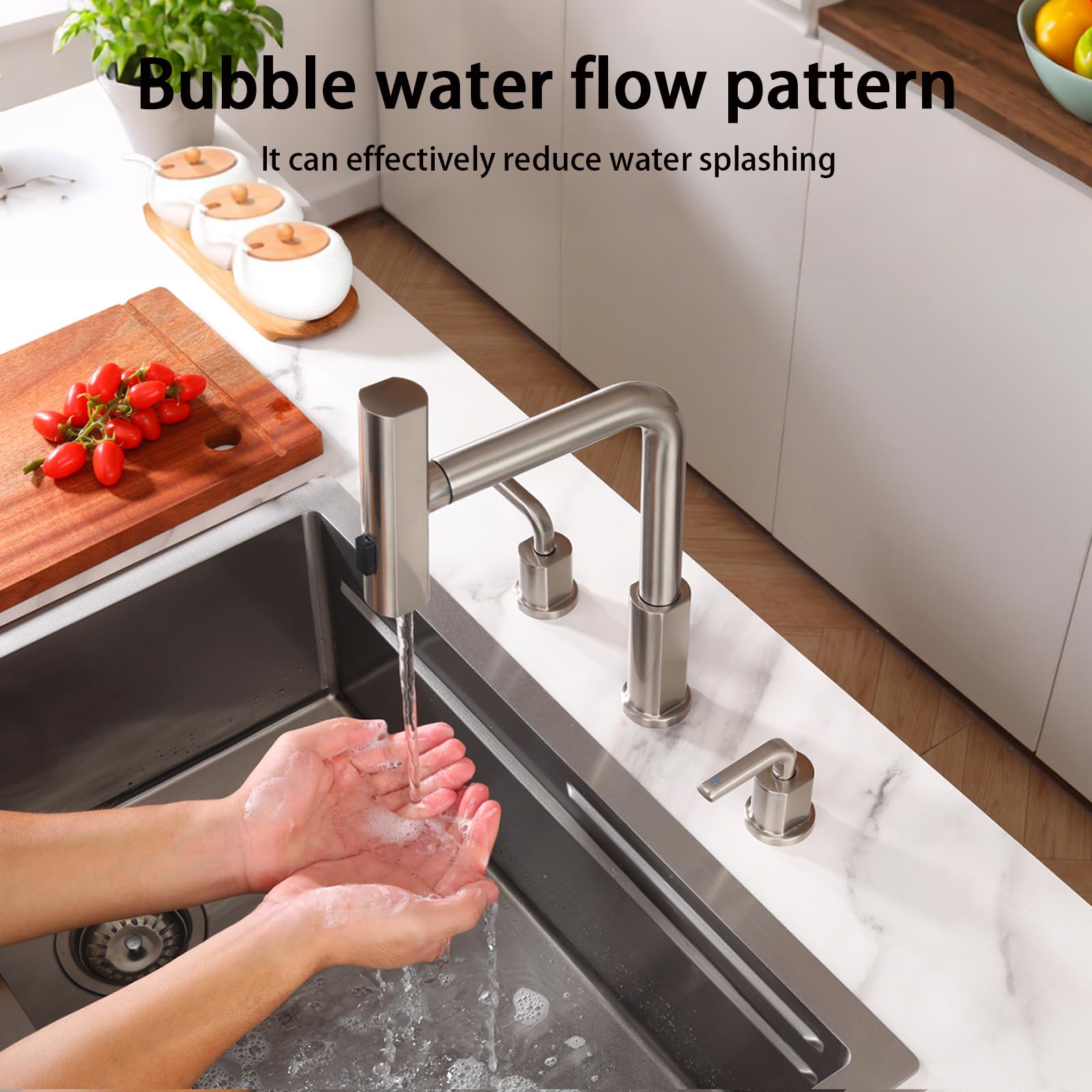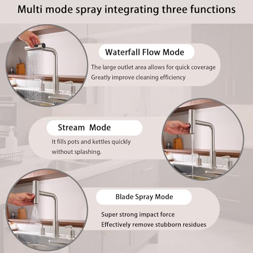 - One Faucet Three Ways: Conquer every kitchen task Utility touch Multi-functional kitchen sink faucet with sprayer with Waterfall、Stream& Sweep Modes to handle everything from filling large pots to rinsing delicate produce. The Pull Out Sprayer extends 18 inches, rotating freely to reach every corner of your sink. Engineered with resistant coatings to prevent scale buildup, it offers both functionality and effortless maintenance. Upgrade your kitchen experience today