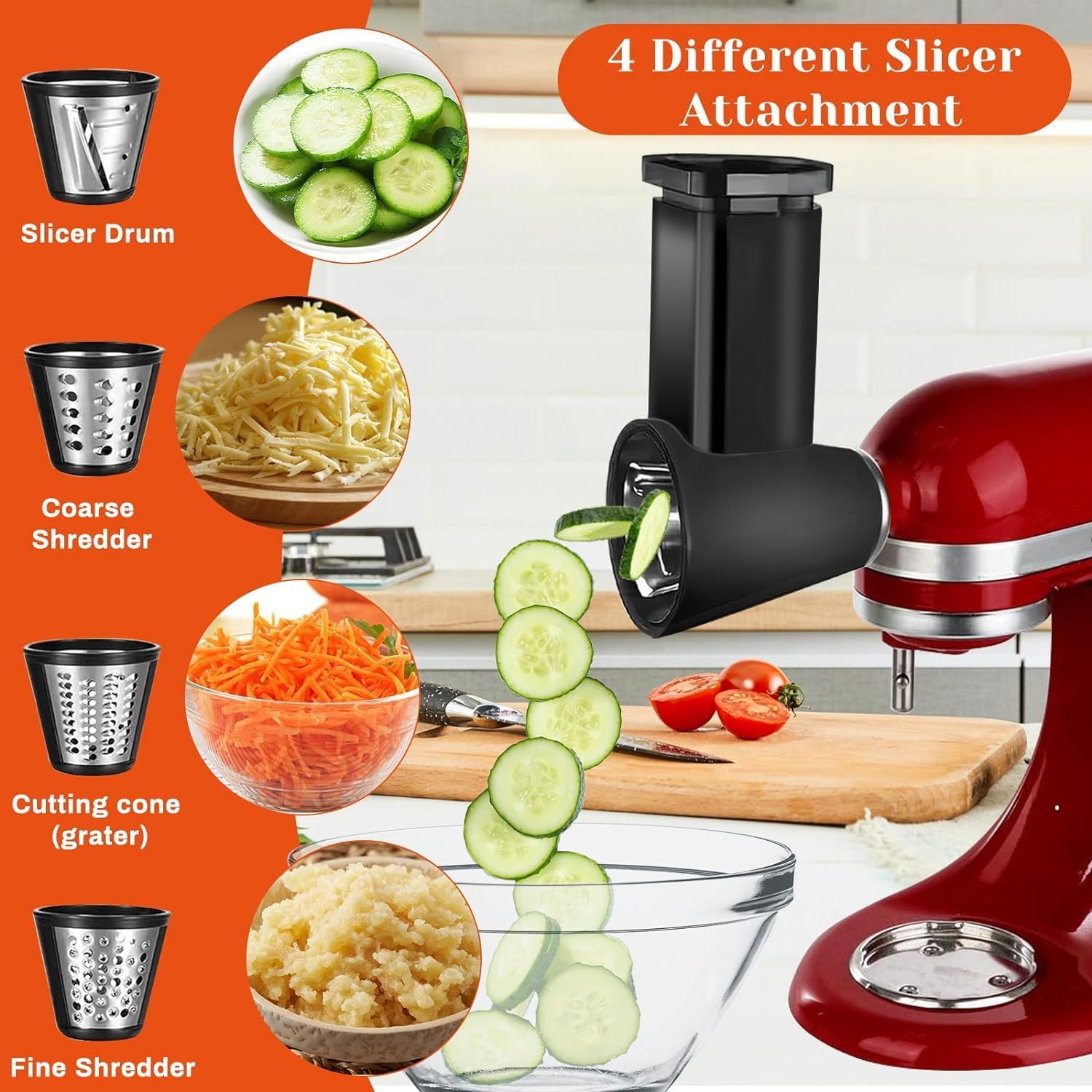 - Enhance your cooking experience with our versatile accessory meat grinder for kitchenaid mixer, which also doubles as a sausage maker. With 4 grinding plates, producing fine, medium, coarse, and kidney-ground meat is a breeze. The 3 different sausage stuffer tubes allow you to create customizable sausage sizes. Additionally, our slicer shredder attachment for kitchenaid stand mixer comes complete with 4 size stainless steel drum blades, allowing you to process vegetables, cheese, nuts, and pizza toppings in no time.