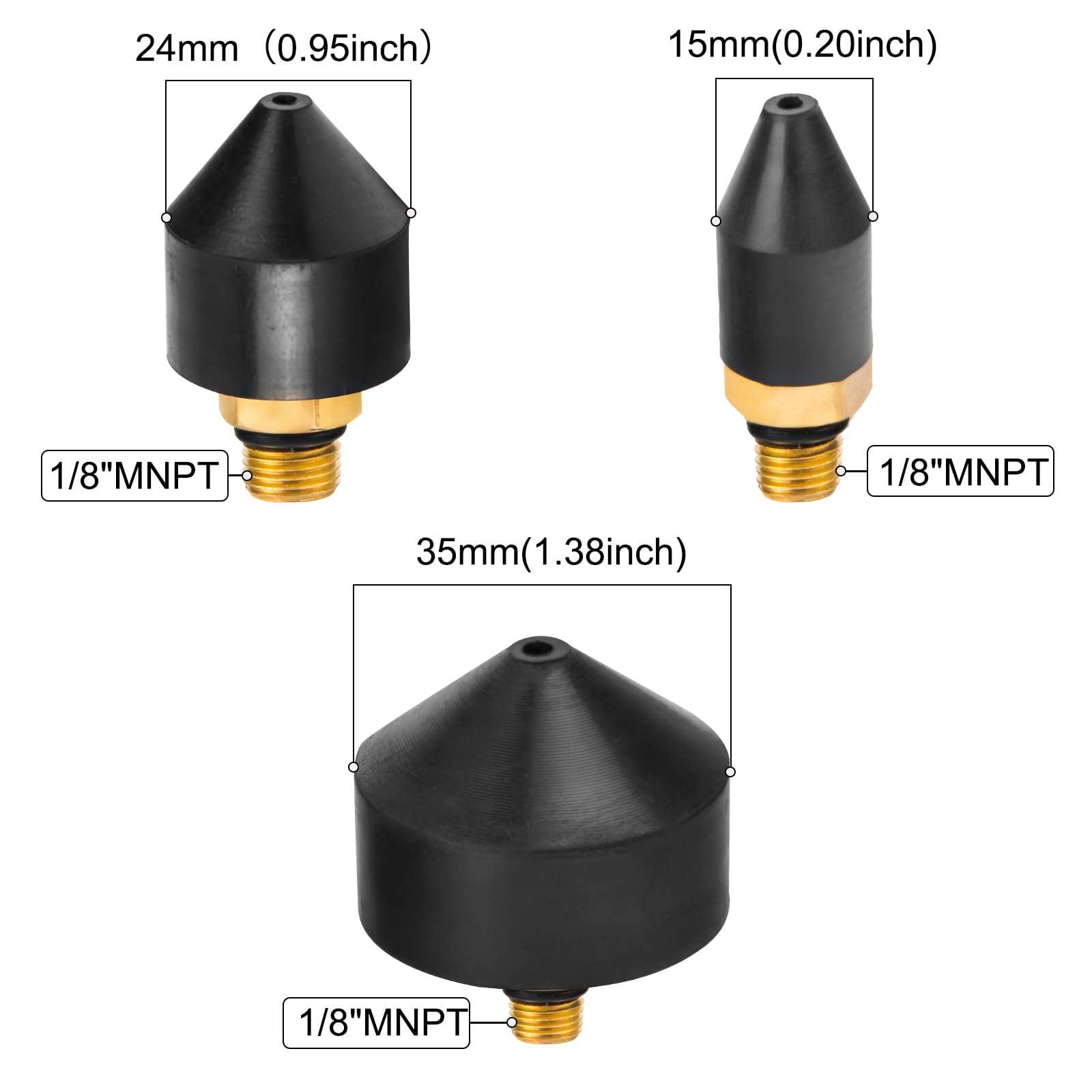 - 【Size】3pcs rubber nozzles are 15mm / 0.2inch, 24mm / 0.95inch, 35mm / 1.38inch, respectively and the fittings are all 1/8"MNPT. And the brass fittings on the ends ensure tight connection and longer lifetime