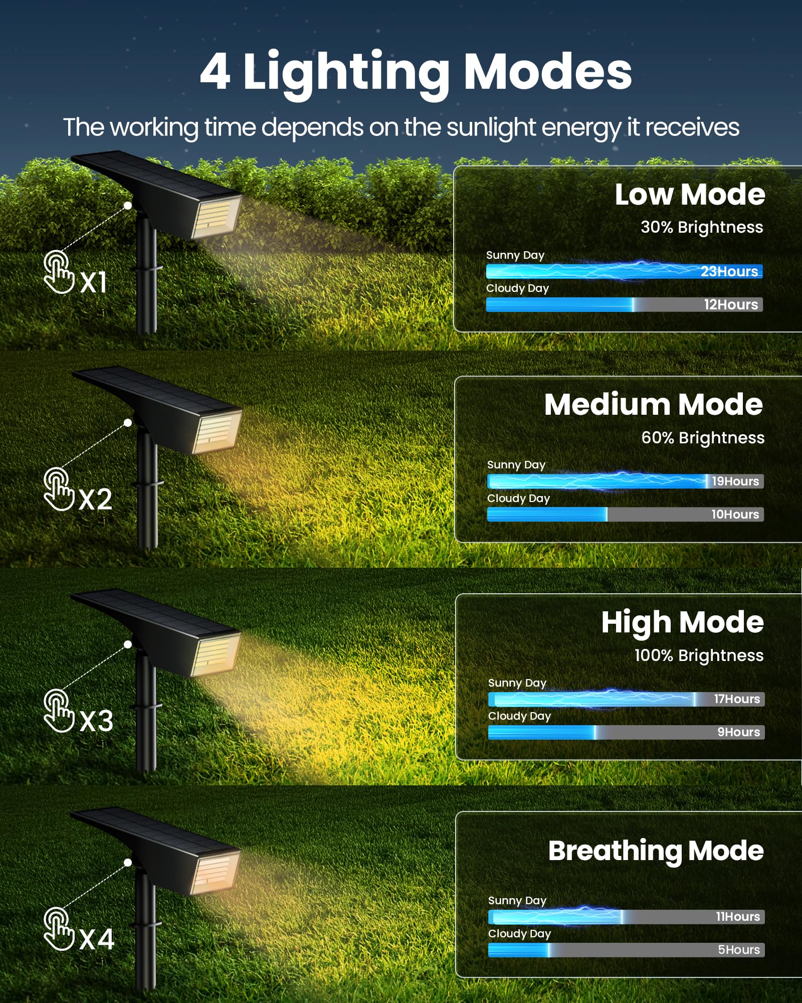 - 4 Brightness Lighting Modes: The solar landscape lights have Low, Medium, and High brightness lighting modes and breathing light modes. Single press the button to control the power and adjust the brightness mode