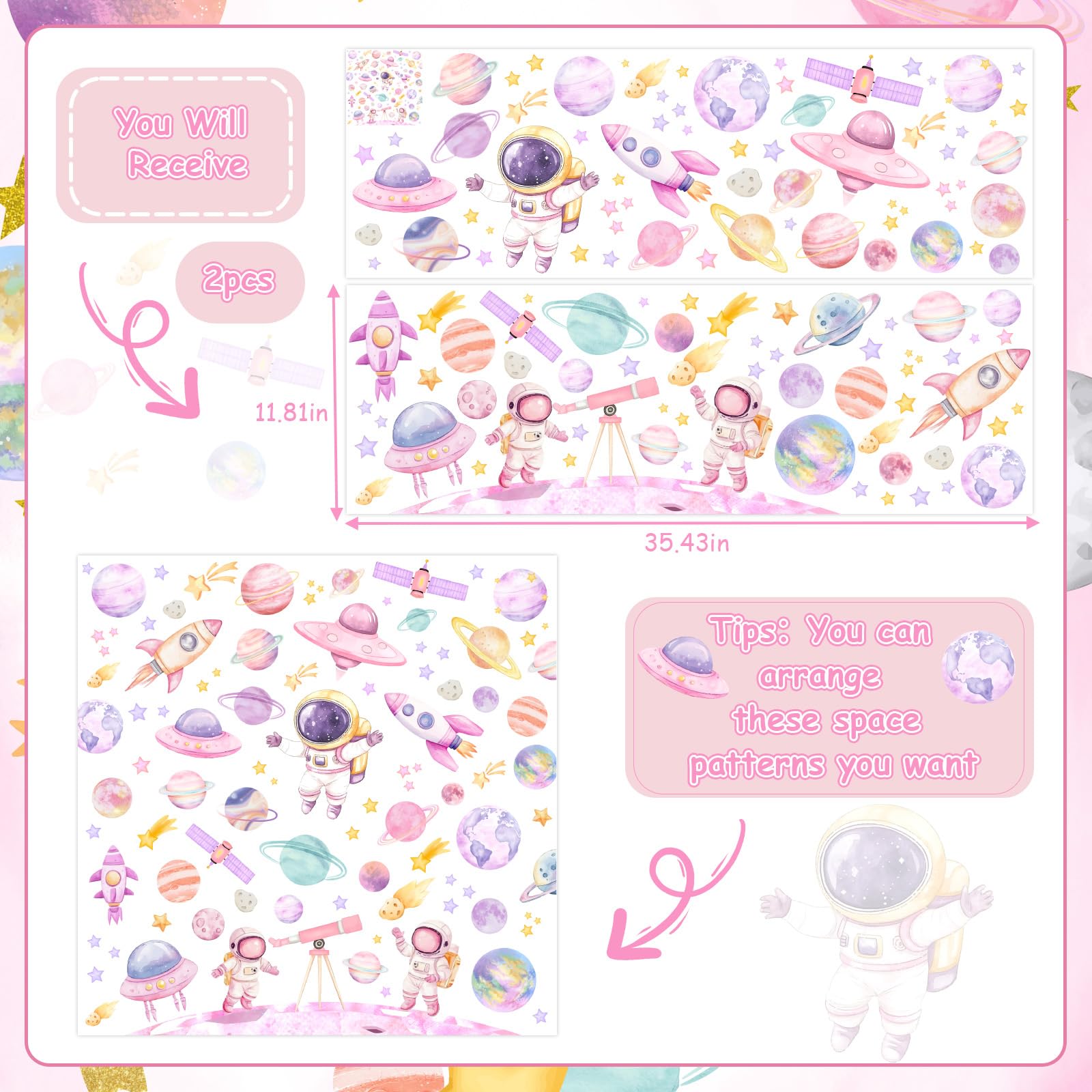 Kreatwow 2pcs Outer Space Wall Stickers for Girl Outer Space Wall Decorations Pink Astronaut Planet Decal Solar System Birthday Decoration Galaxy Rocket Cling Sticker Galaxy Astronaut Party Home Decor