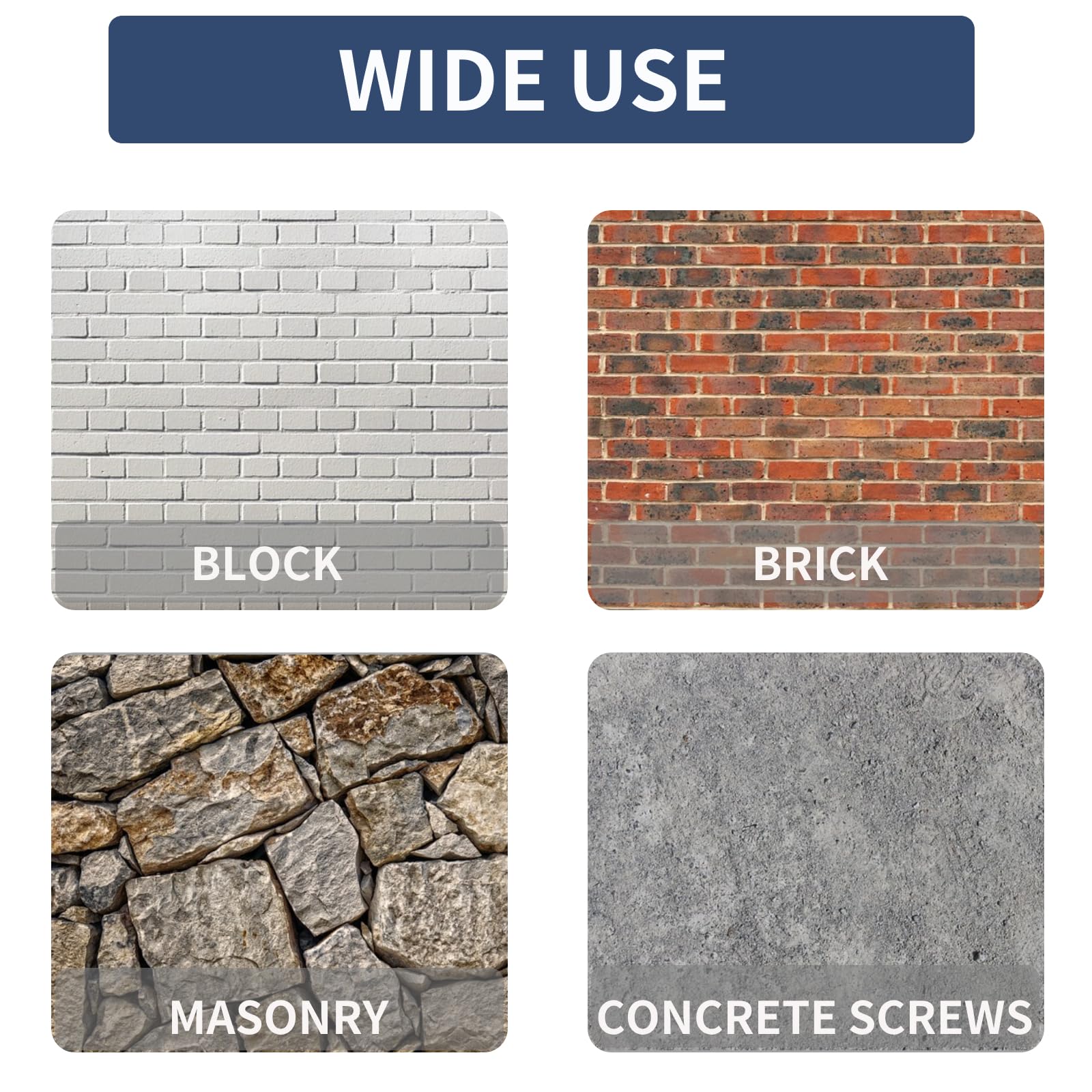- Widely Applications:Concrete screws are ideal for use in concrete, masonry, mortar Walls,cement, blocks, and bricks cinderblock,stucco materials, such as secured and anchoring shelf, metal art,hooks,electrical box,solar lights,foam board,grab bars,conduit, cameras, antennas and brackets