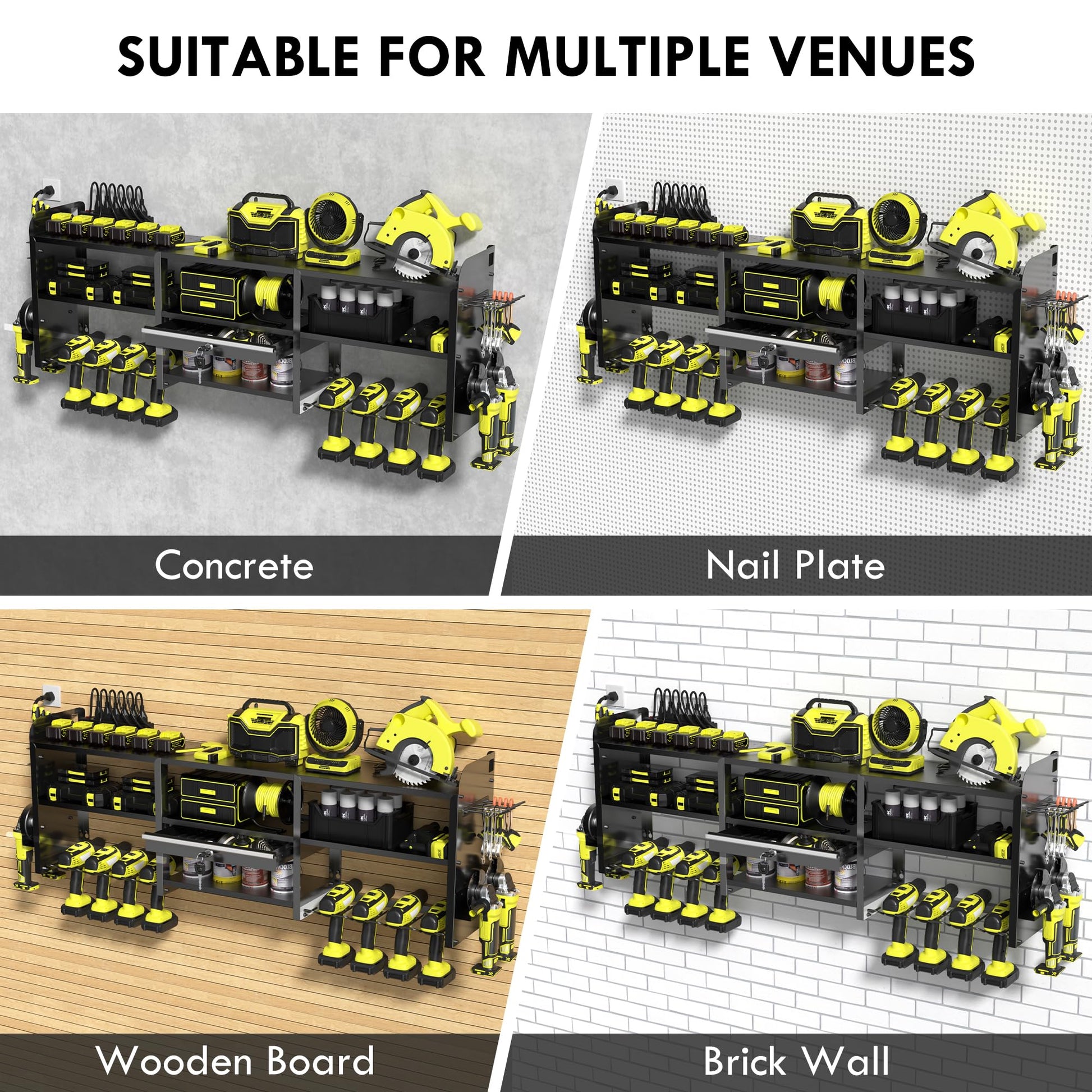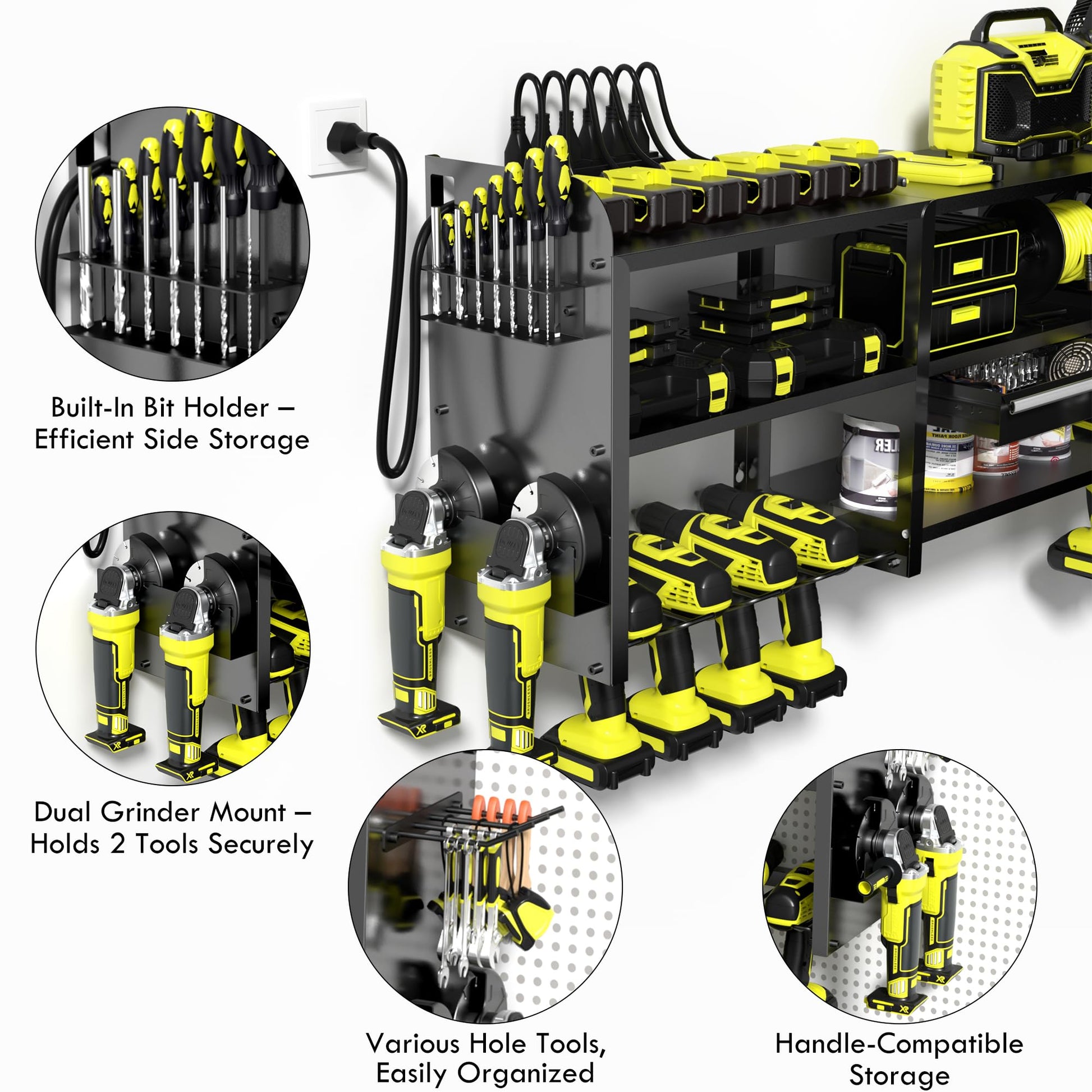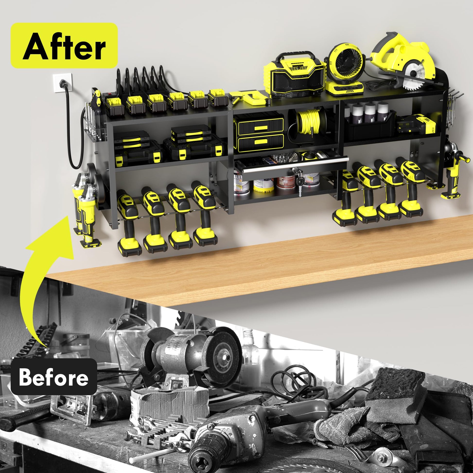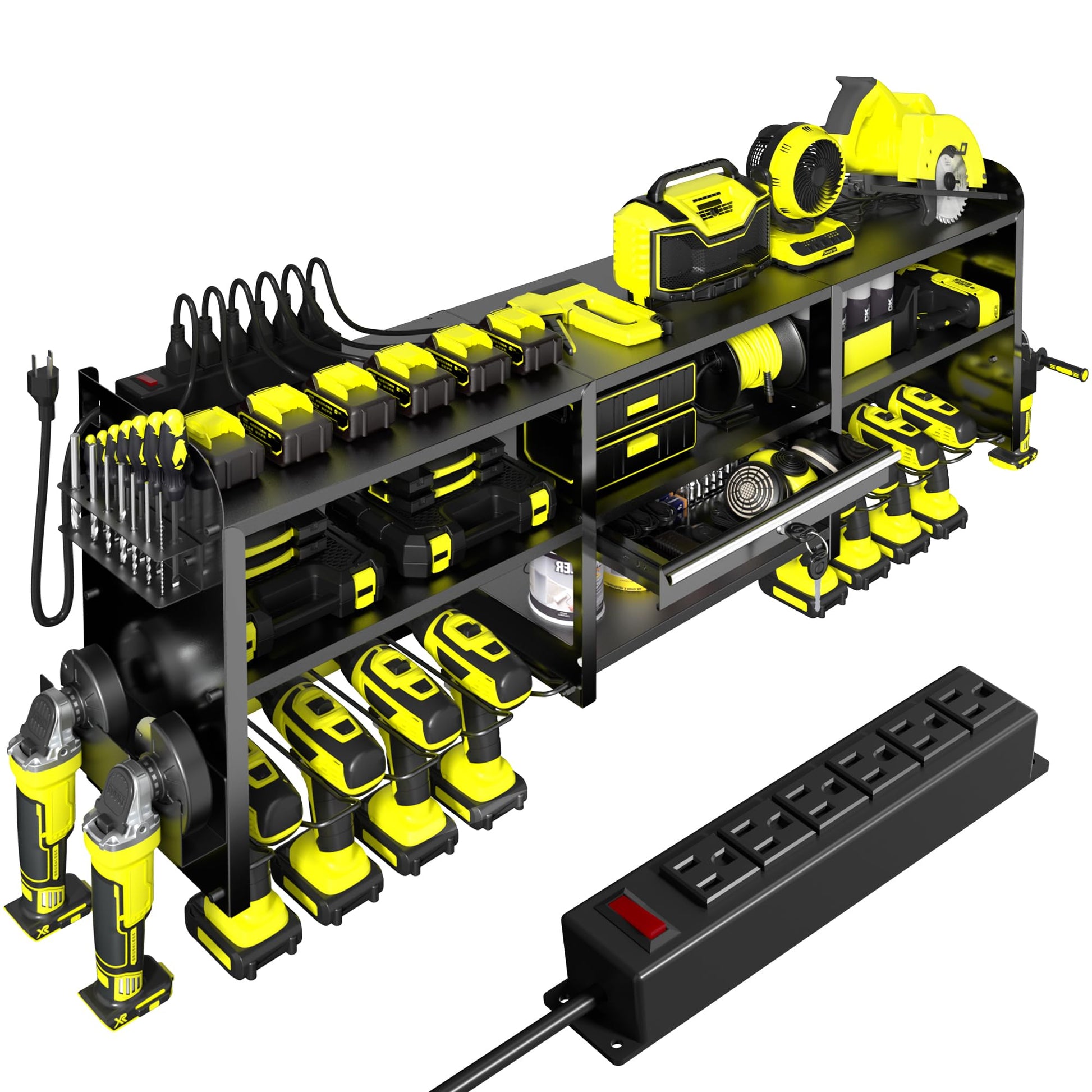 - 【Built-in Charging Station with 6 Outlets】 KSVO power tool organizer comes equipped with 6 AC outlets (125V/15A/1875W), allowing you to charge multiple cordless tools and batteries simultaneously. The included 5-foot 14AWG power cord ensures flexible installation for various garage or workshop setups