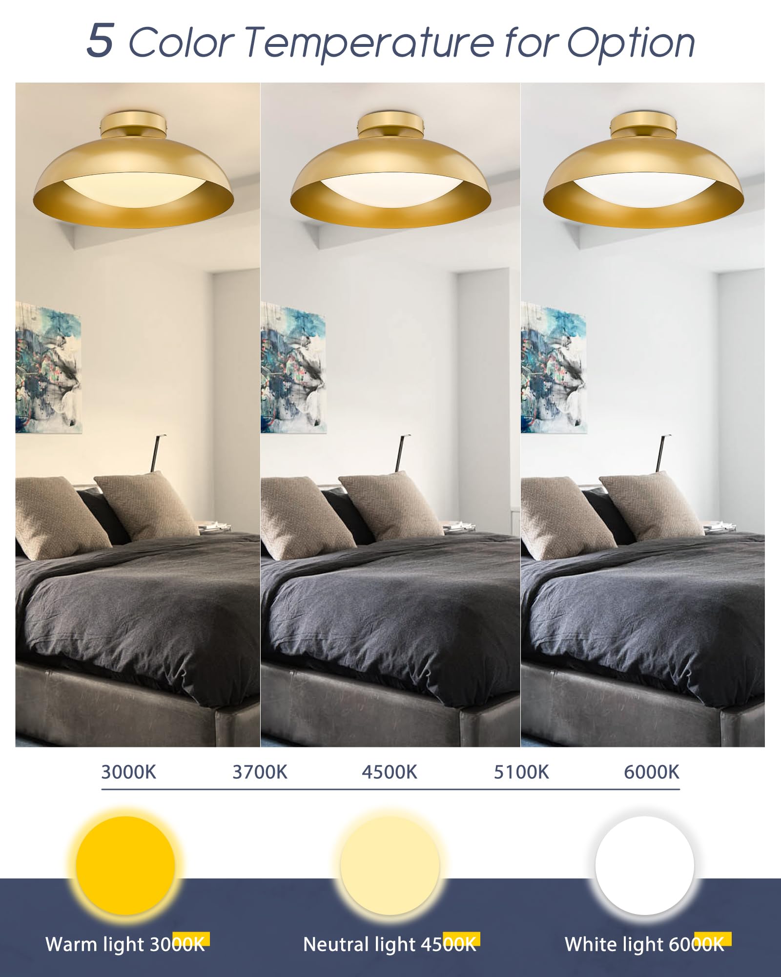 kudos Gold Semi Flush Mount Ceiling Light, 16 Inch LED Ceiling Light Fixtures, 23W/1300Lm Light Fixtures Ceiling Mount, 5CCT Adjustable, KDCL02-GD