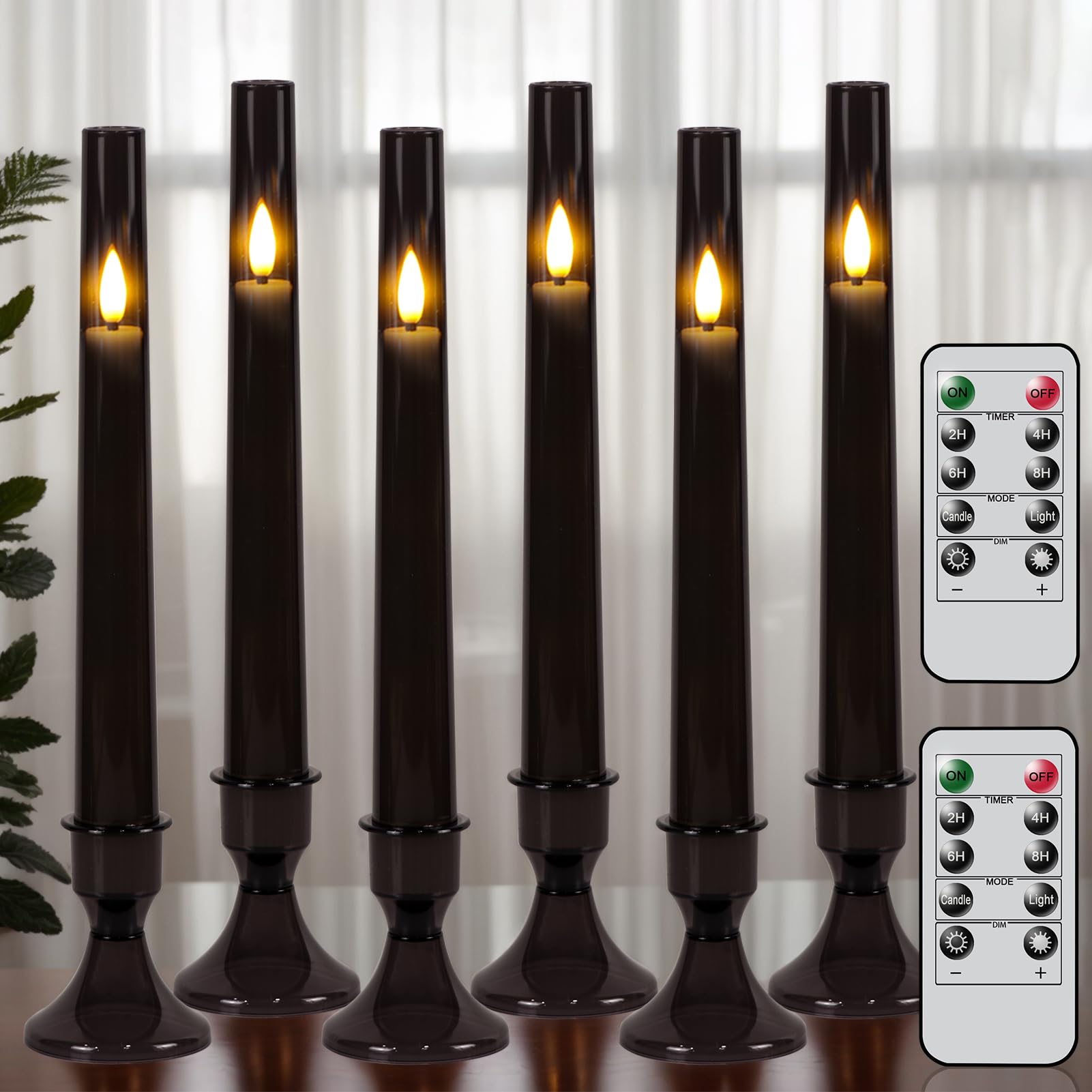 KunSwenn Black Flameless Taper Candles with Remote, Halloween Battery Operated Taper Candles with Base, LED Flameless Battery Candlesticks for Home Holiday Decor(Set of 6, Acrylic Shell)