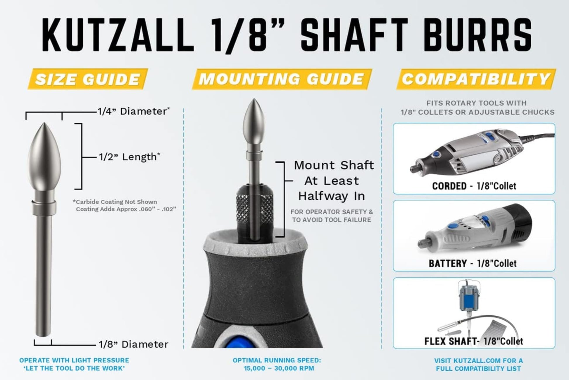 - Easy to Control: The Rotary Burrs can easily cut with or against the grain with incredibly smooth cutting action. The 1/8" diameter shaft burrs are great for intricate details and small areas. **Must use with 1/8" collet or adjustable chuck**