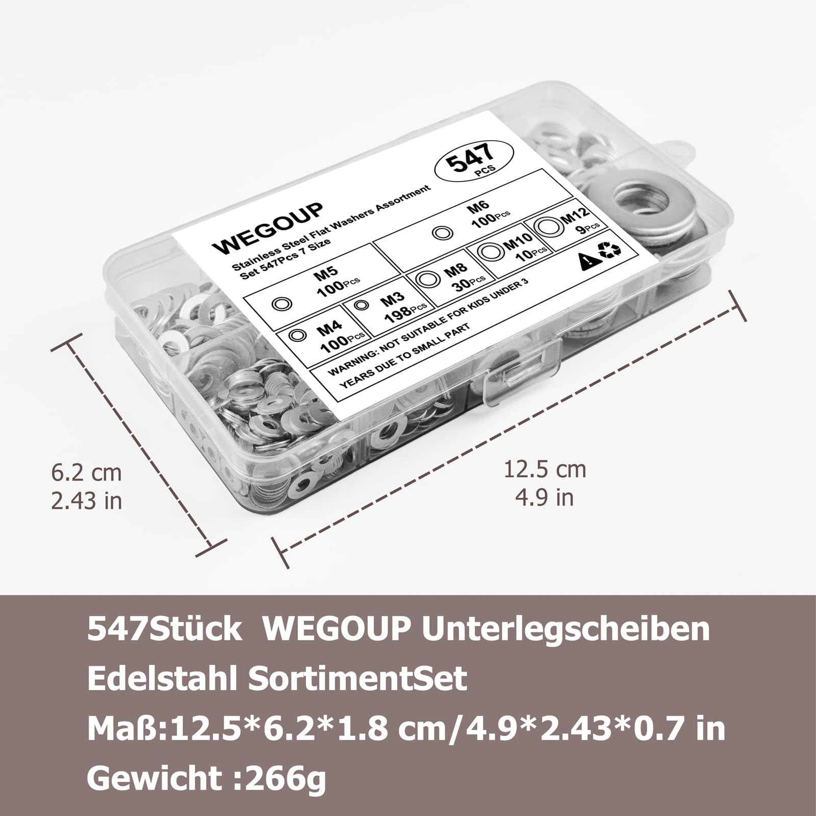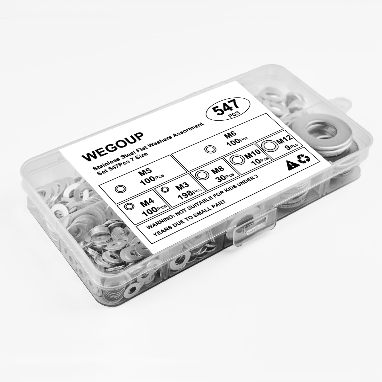 Kviceo Stainless Steel Flat Washer Set – 18-8 (304) Stainless Steel, Assorted Sizes for Automotive, Home, Industrial & DIY Use, with Plastic Case (547, M3, M4, M5, M6, M8, M10, M12)