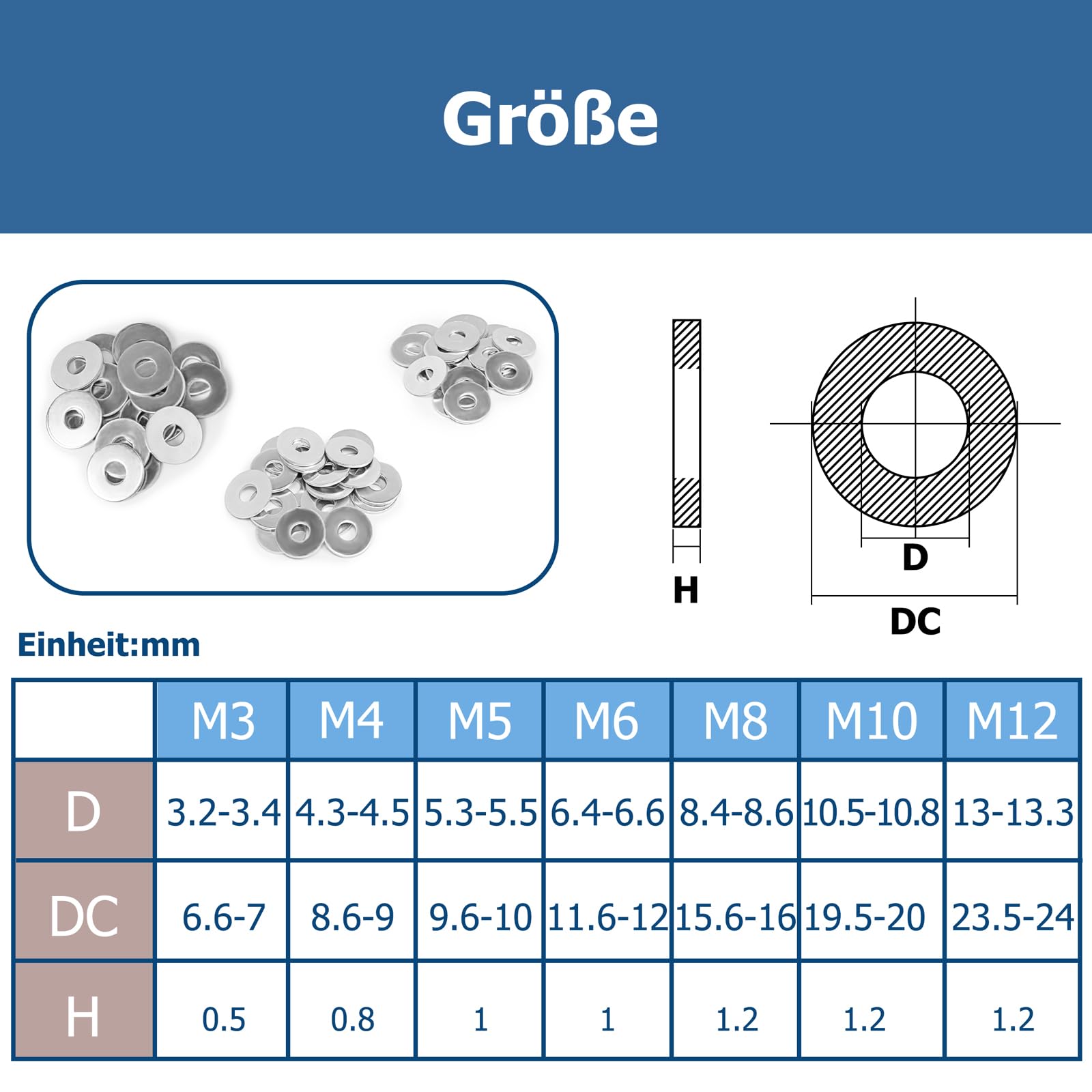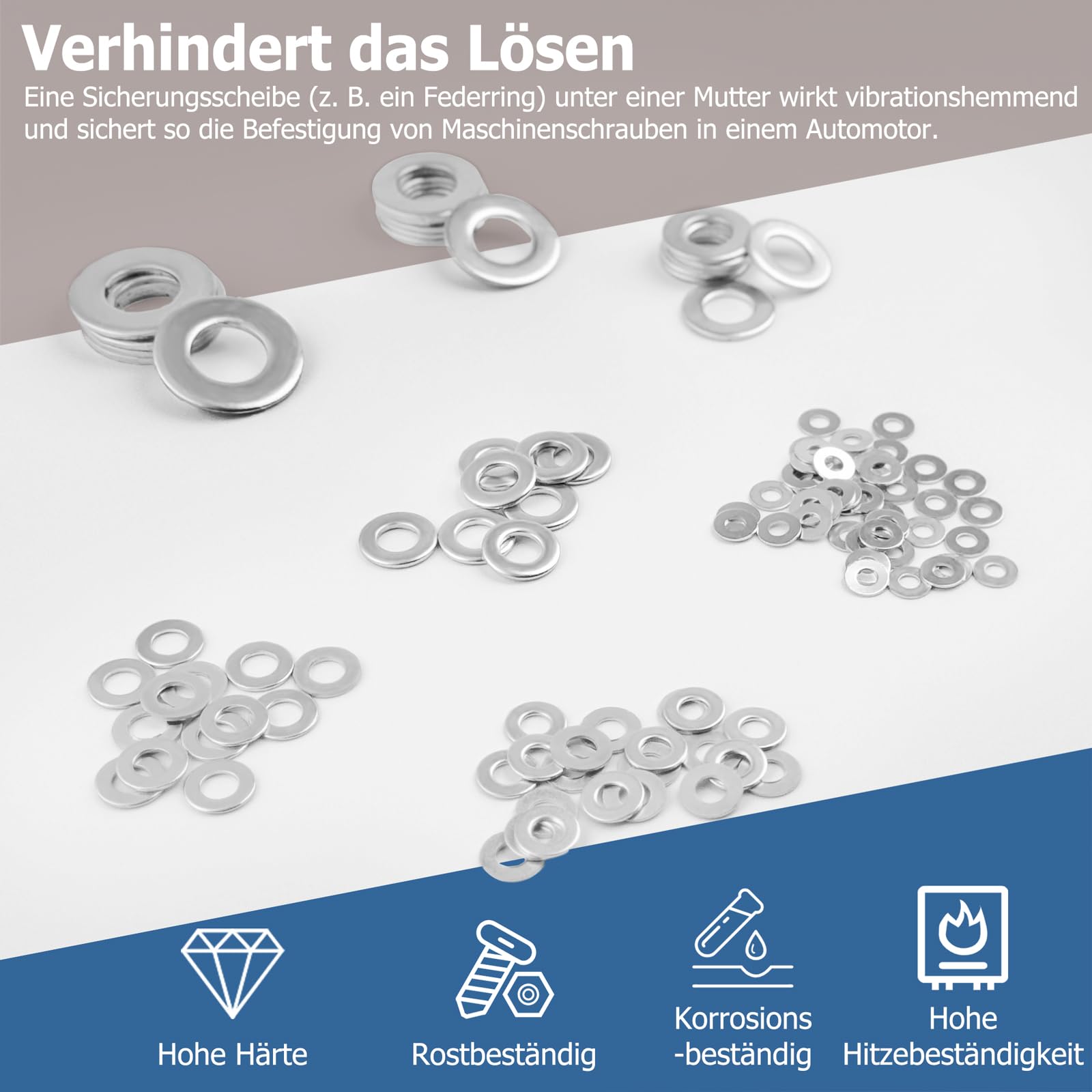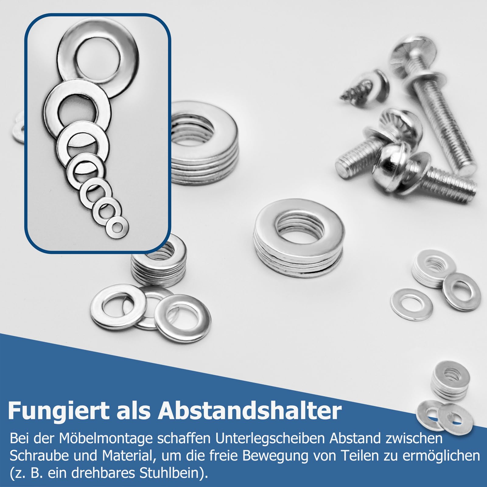 - 1.Complete Washer Assortment Kit (M3–M12) – Includes a wide selection of flat washers in multiple sizes, suitable for various screw and bolt applications. Perfect for DIY projects, home improvement, automotive maintenance, furniture assembly, plumbing work, and general industrial use.