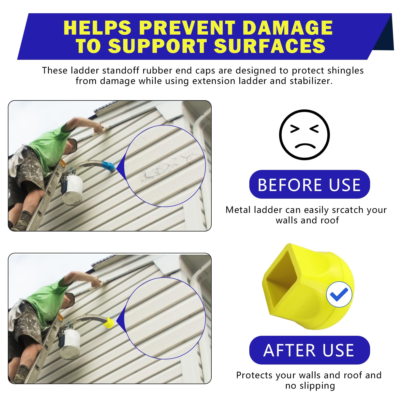 - 【Provides Great Protection】These ladder standoff rubber end caps are designed to protect shingles from damage while using extension ladder and stabilizer. Non-marring design keeps surfaces clean and protects your walls and roof shingles or wood and vinyl siding and no slipping. Great protection for substrate stabilizer rests against