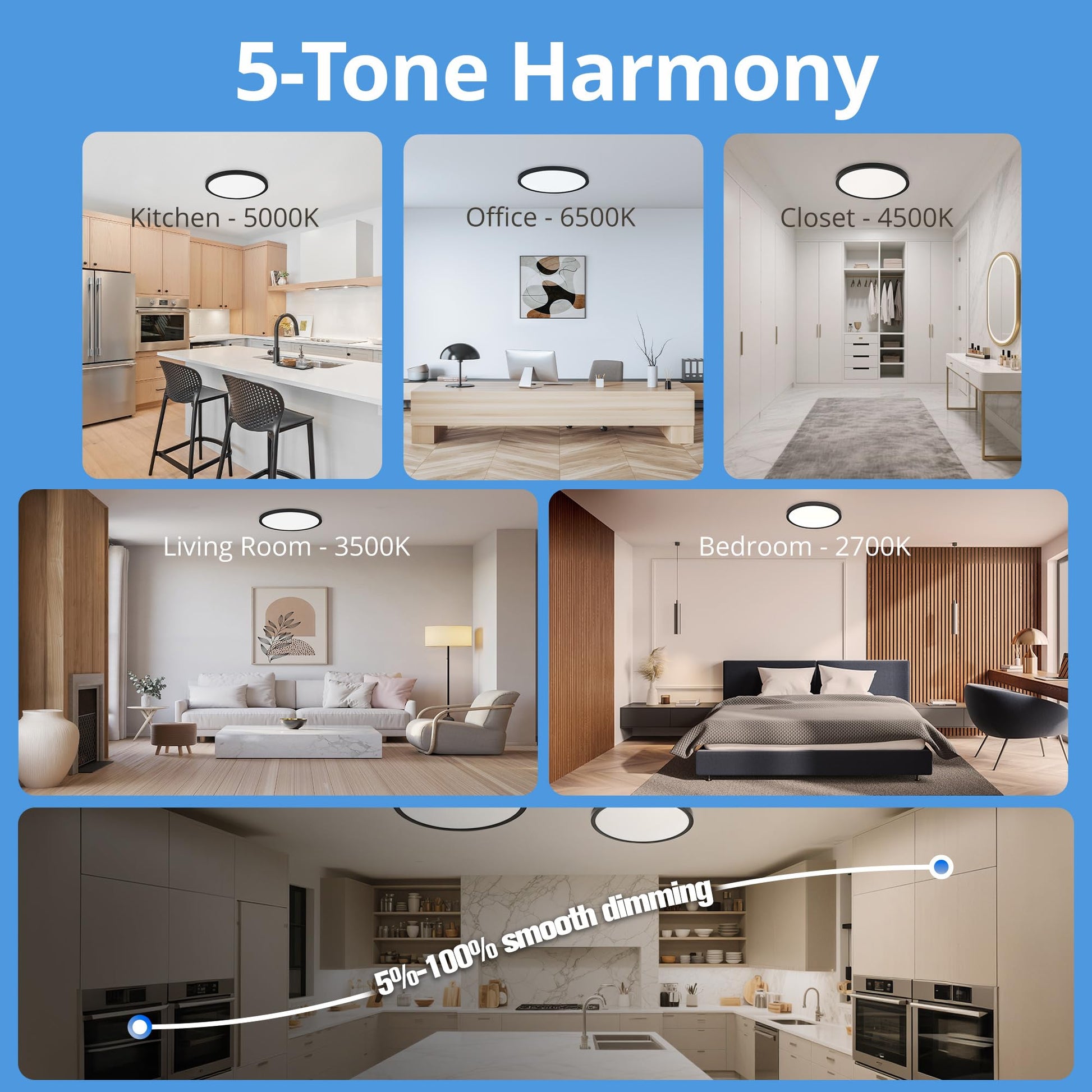 - 【5 Color Temperature Modes (2700K-6500K) & Dimmable】The Laiyidia's low profile led ceiling fixtures can be adjusted from warm yellow (bedroom cozy) to bright white (kitchen task lighting), Works with both dimmer switches (5%-100% smooth dimming) and standard switches (steady lighting). Perfect for bedrooms, kitchens, hallways, and more.