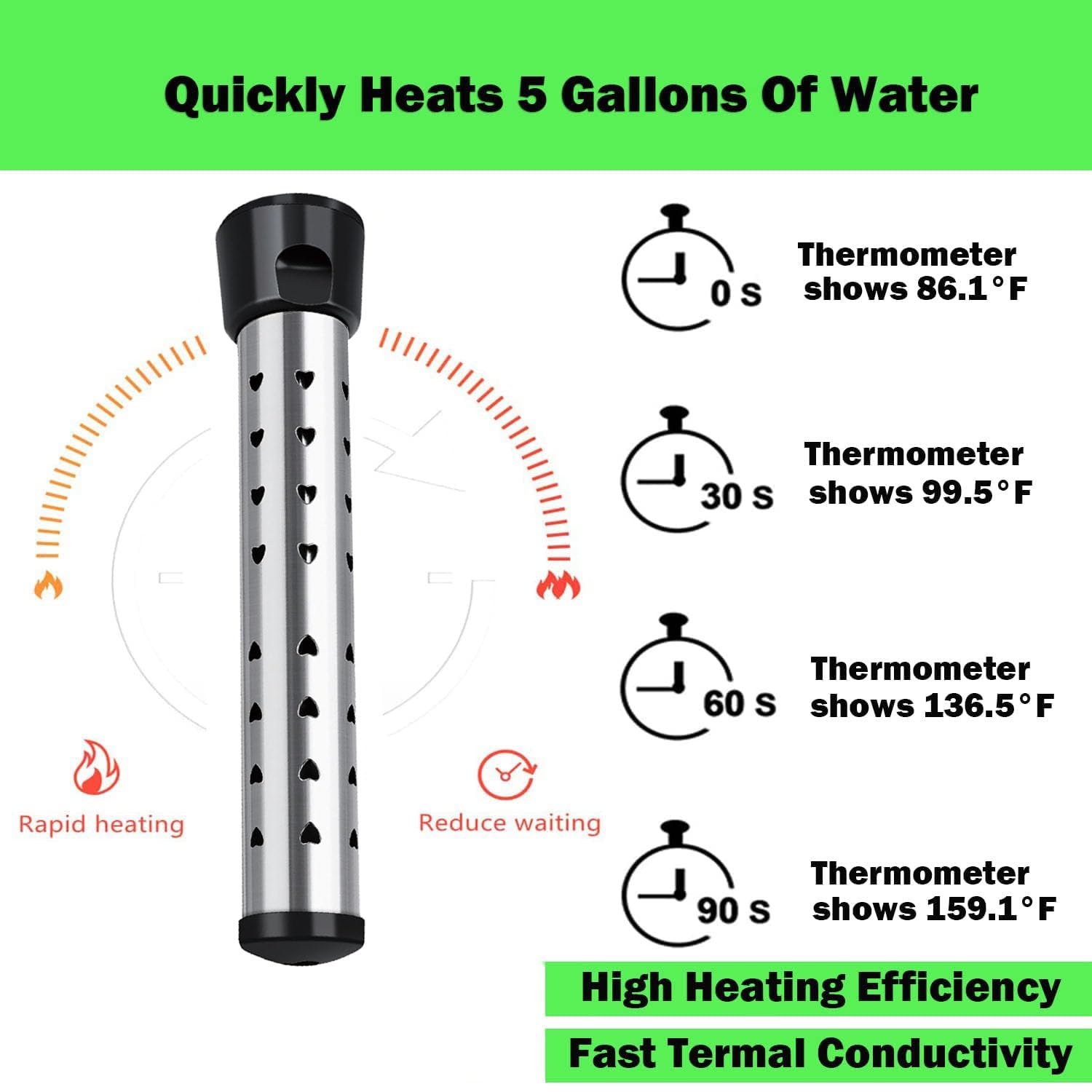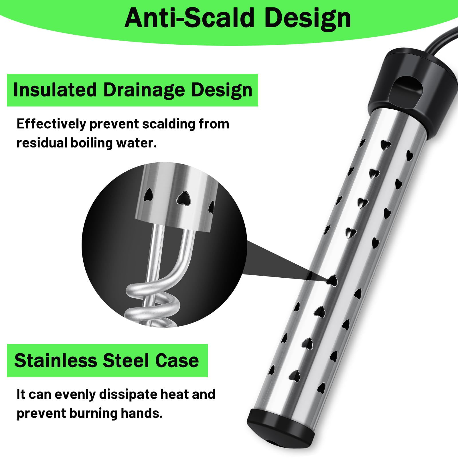 - SAFETY DESIGN: UL certified instant water heater with high-quality stainless steel protective cover, effectively prevent heating elements from direct contact with humans or animals, rust resistant and durable. Our immersion water heaters are designed with intelligent temperature control and automatically cut off the power when the water temperature reaches 75 ° C (165°F).WARNING:When using, first put the water heater into the water, be sure to ensure that the water heater is fully immersed in water, and then plug in the socket. Determine the operation sequence to effectively prevent fire.